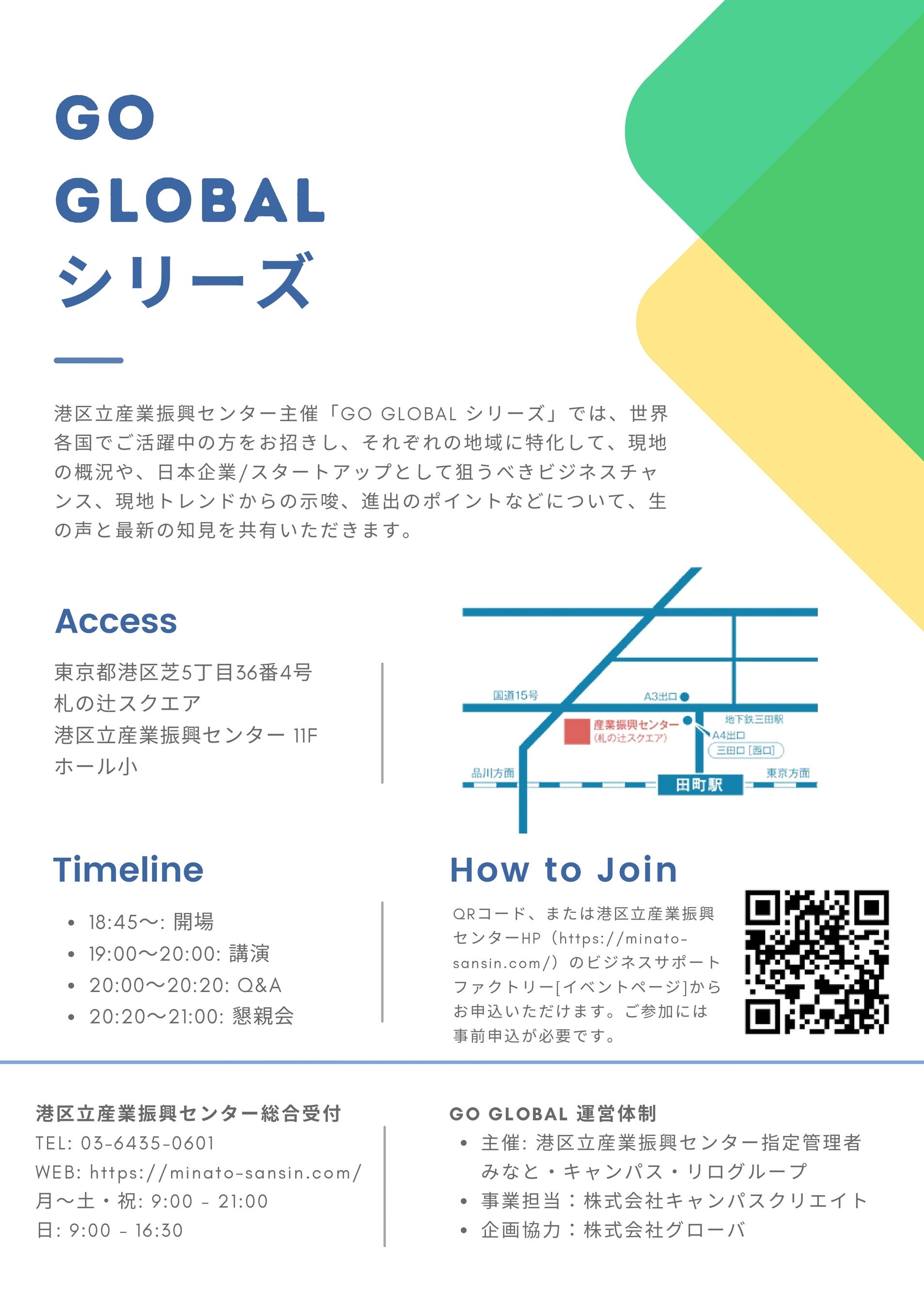 港区立産業振興センターは、世界各国のエコシステムや大使館等とともに共創パートナーシッププラットフォーム構築を目指しており、その活動の一環としてセミナー「GO GLOBAL」シリーズを開始しました。共創パートナーとの連携を基軸とした、日本企業・スタートアップのグローバル展開支援を目的としています。