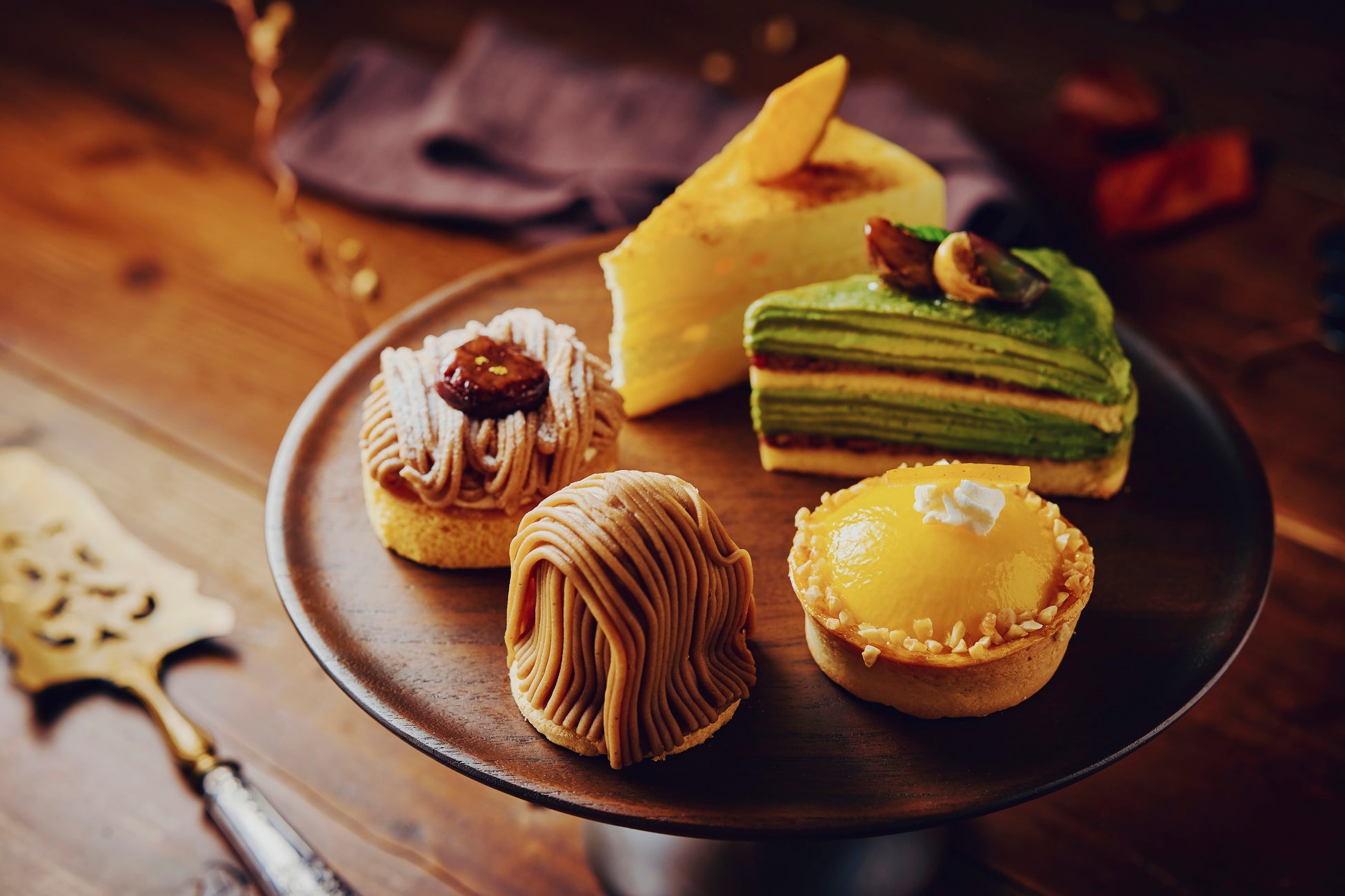 ・ケーキ各種(9種) ¥820〜¥1,020(マカロンのヴェリーヌ ¥1,020、葡萄のプリンアラモード ¥1,020、苺のフルーツショートケーキ ¥1,020、マスカットのバスクチーズケーキ ¥1,020、栗のモンブラン ¥1,020、キャラメルナッツショコラ ¥1,020、さつま芋のタルト ¥920、林檎のミルフィーユ ¥920、洋梨のシブースト ¥820)
