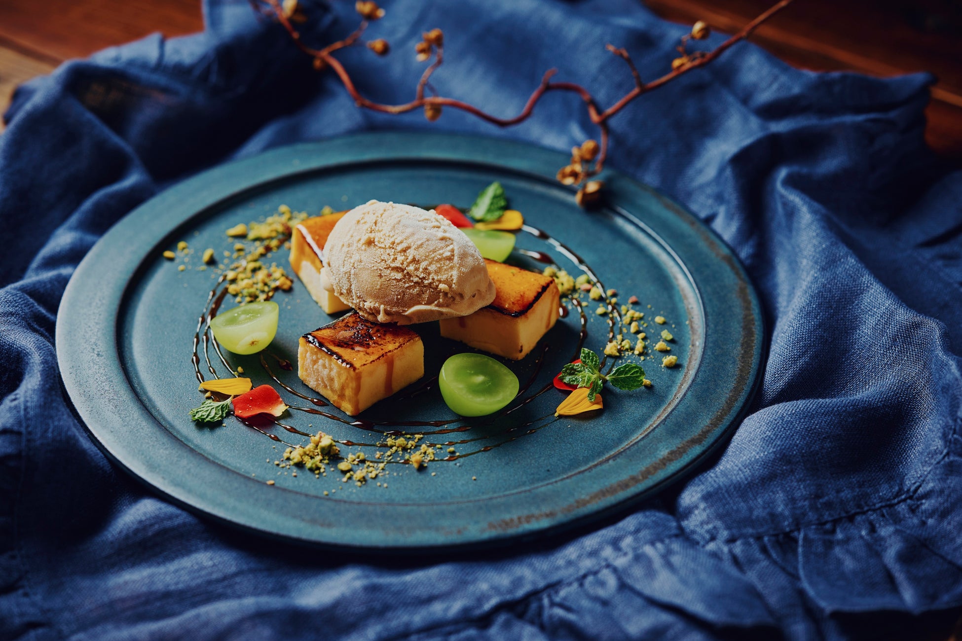 シャインマスカット(フレッシュ)、いちぢく(フレッシュ、ドライ)、洋梨の赤ワインコンポートとぶどうのムース、かぼちゃのチップ、バウムクーヘンなどで秋を表現した一皿です