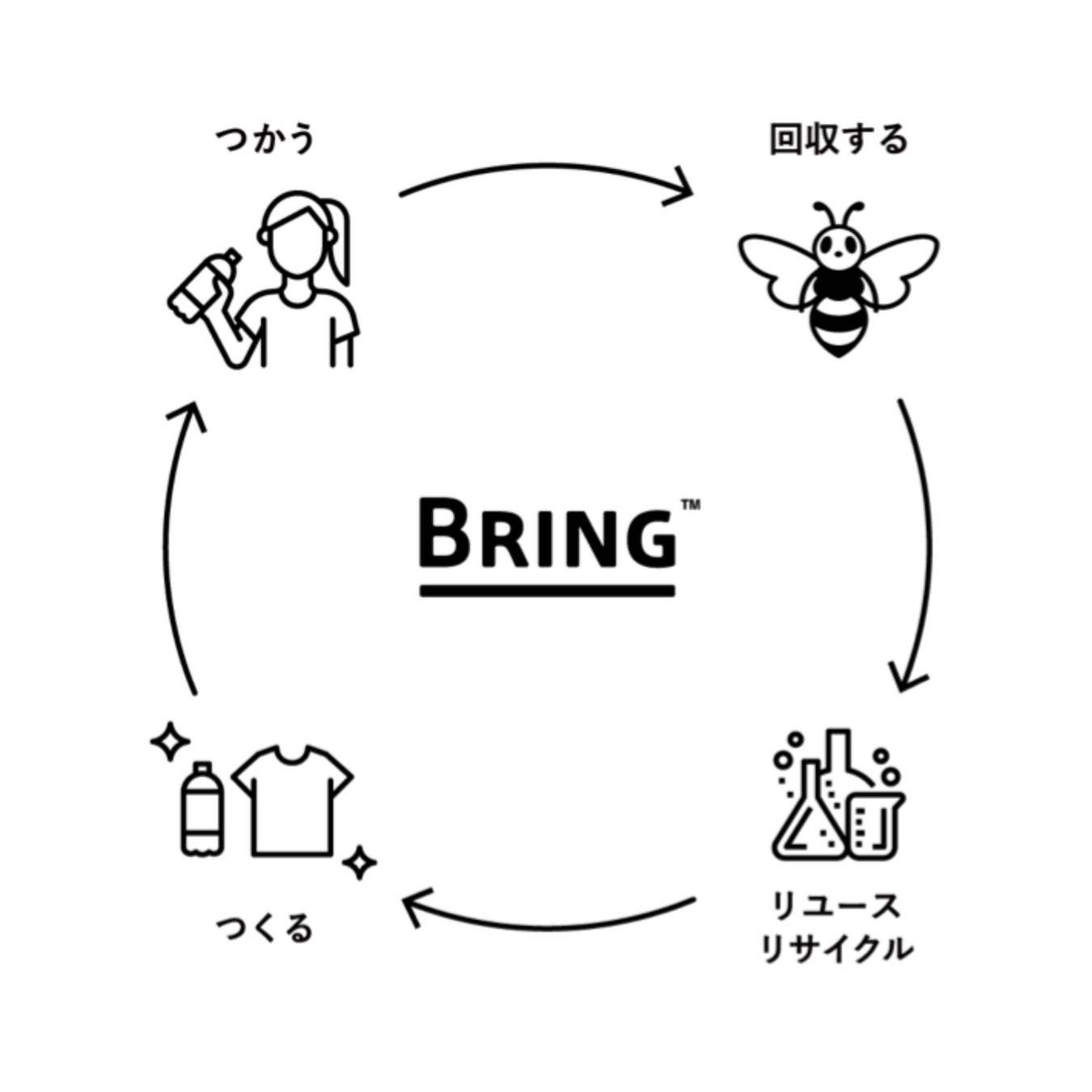 BRINGは、消費者や企業・自治体と協力をして不要になった服や使用済みのPETボトル等を回収し、リユースや多様なリサイクル技術で原料や新しい製品等に再生し、市場や消費者の手元にまで循環させ、その循環を軸とした様々なビジネスを展開することで、サーキュラーエコノミーを社会に実装しています。さらに、独自の技術を用いて、不要な衣類(ポリエステル対象)や使用済みPETボトルから何度も循環する再生素材を製造することで、持続可能な循環型社会の実現に貢献しています。