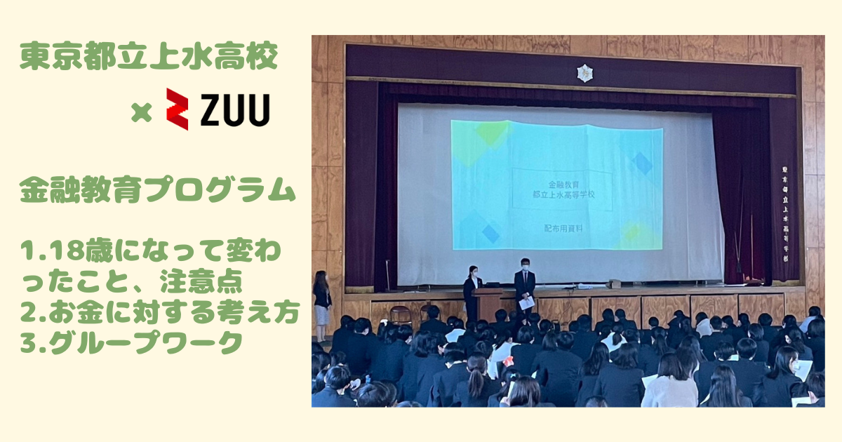 株式会社ZUU(本社:東京都目黒区、代表取締役:冨田 和成、以下「ZUU」)は、東京都教育委員会が運営する「子供を笑顔にするプロジェクト*1」を通じて1月19日に東京都立上水高校にて、金融×ICTを活用した『金融教育体験プログラム』の出張授業を行いました。
