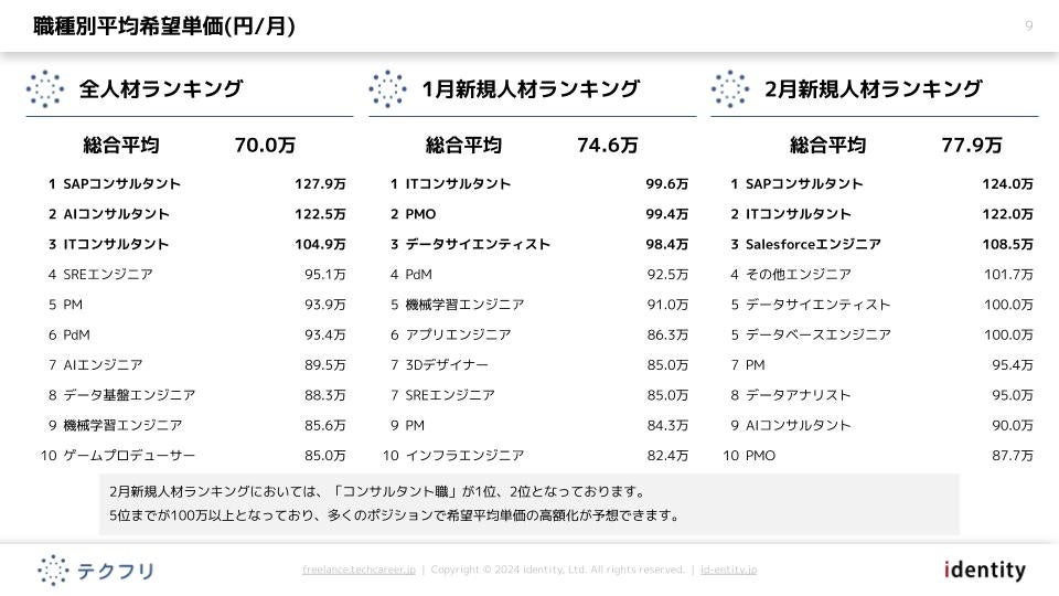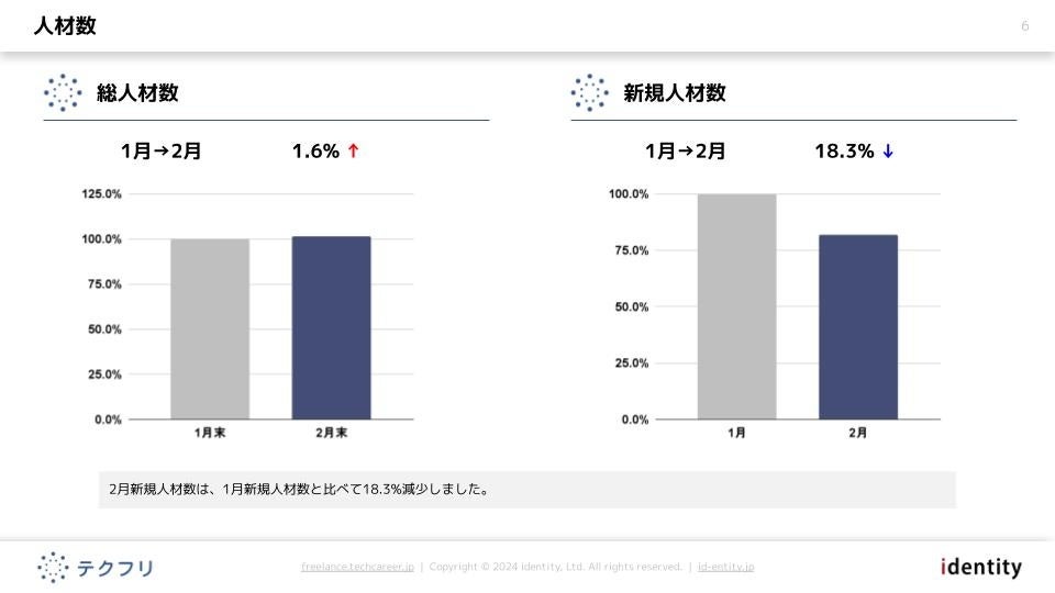ITフリーランスエンジニアの案件・求人サイト「テクフリ」(https://freelance.techcareer.jp/)を運営する株式会社アイデンティティー(東京都新宿区、代表取締役:今野 力、以下「当社」)は、テクフリのデータベースをもとに2025年2月における人材の市況感を調査しました。より詳しい結果については、お問い合わせから資料請求が可能です。