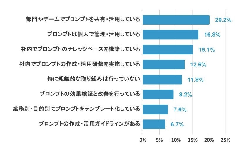プロンプトの管理・活用状況について尋ねたところ、「部門やチームでプロンプトを共有・活用」(20.2%)が最多で、「社内でプロンプトのナレッジベース構築」(15.1%)や「プロンプト作成・活用研修実施」(12.6%)など組織的取り組みが見られる一方、「個人で管理・活用」(16.8%)や「特に組織的な取り組みなし」(11.8%)も多く、二極化の傾向があります。