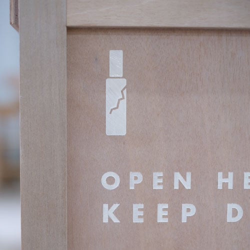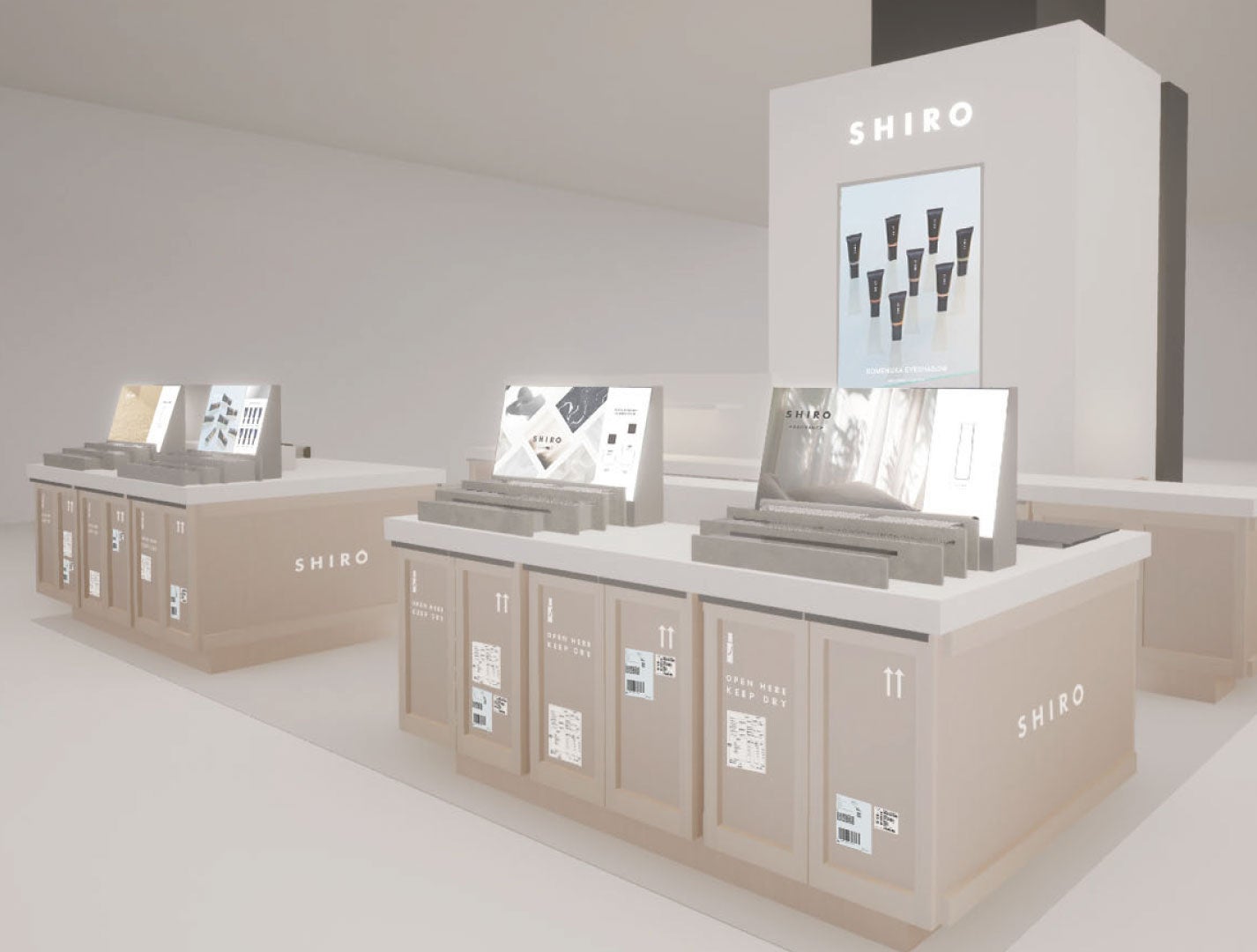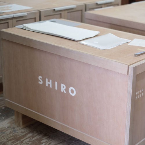 木箱の条件として必要なのはポータブル性と、搬送に適したサイズや形状。SHIROのロゴを入れ、運搬時の注意喚起マークも什器として店舗に置かれたときに製品を引き立たせるよう、シンプルで可愛らしいペイントを施しています。そして運搬時についてしまう傷や汚れさえもストーリーのひとつに。モジュール化しながら強固につくり上げ、什器としてメンテナンスを繰り返して使用しつづけ、役目を終えたとき歴史を積み重ねた木箱が再び搬送用になるそんな未来も考えています。