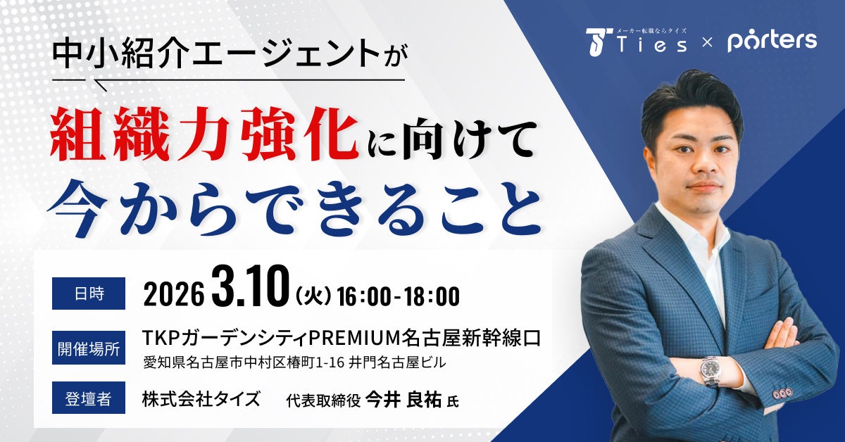 人材ビジネス向けマッチングシステムを提供するポーターズ株式会社(東京証券取引所グロース.証券コード5126、東京都港区、代表 西森 康二)は、株式会社タイズにて代表取締役を務める今井良祐氏をお招きし、「中小紹介エージェントが組織力強化に向けて今からできること」と題した無料のオフラインイベントを2026年3月10日(火)16:00~18:00に名古屋にて開催します。