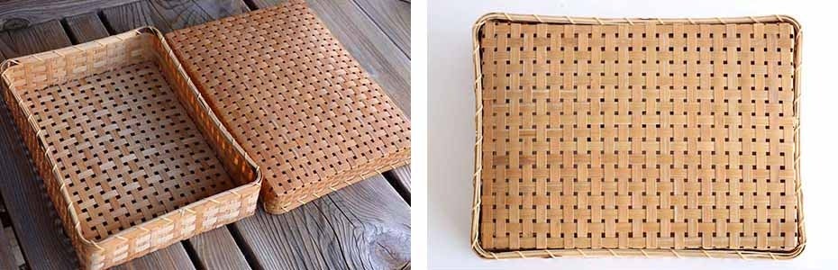 竹編みの素地には、日本の職人による純国産素材を採用。竹ヒゴを用いて丹念に編み上げた四ツ目編みは、均整の取れた美しさと精密さが特徴です。大小の箱がきっちりと入れ子になる設計は、昔ながらの熟練技術の証です。