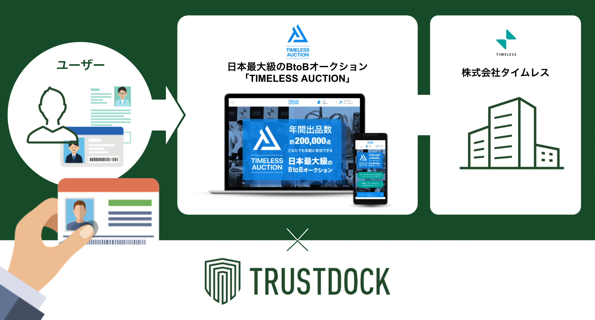 導入社数No.1(※)のオンライン本人確認/eKYCを提供する株式会社TRUSTDOCK(本社:東京都千代田区、代表取締役:千葉 孝浩、以下 TRUSTDOCK)と株式会社タイムレス(本社:東京都港区、代表取締役:太田 大哉、以下 タイムレス)は、本人確認業務の代行において業務提携することに合意し、タイムレスが展開する、日本最大級のBtoBオークション「TIMELESS AUCTION」に、本人確認APIの導入実施を完了したことをご報告します。