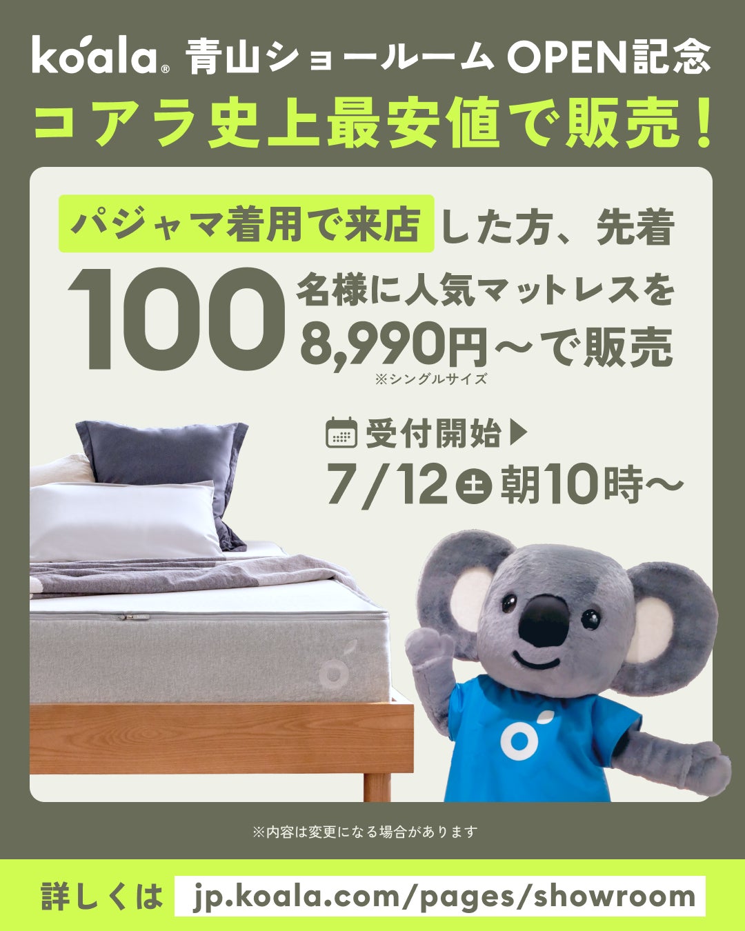 オープン初日の7月12日(土)にコアラ青山ショールームにパジャマ着用で来店した方、先着100名様に「コアラマットレス KORE」をコアラ史上最安値の8,990円〜(シングル定価89,900円〜)の特別価格で販売します!今年5月に「ZIP!」(日本テレビ)で「実際に使って1番良かった睡眠グッズ」として紹介された人気モデルは在庫限りです!欲しい方は、ぜひパジャマでご来店ください。