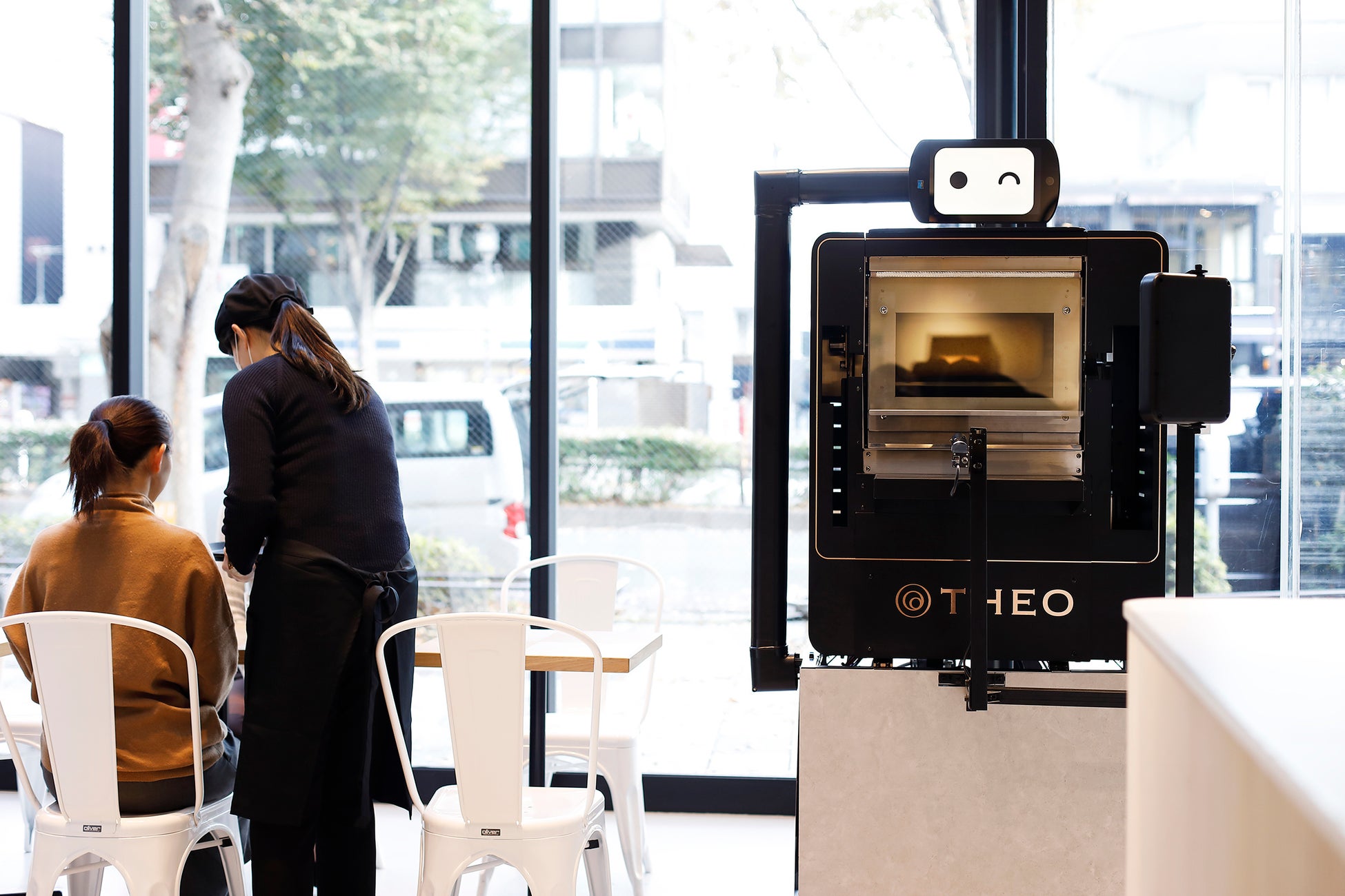 THEO(テオ)は株式会社ユーハイムが開発したバウムクーヘンAI職人です。職人が焼く生地の焼き具合を各層ごとに画像センサーで解析し、その技術をAIに機械学習させデータ化、無人で職人と同等レベルのバウムクーヘンを焼きあげることができます。ユーハイムの熟練職人のほか、ロボット工学の研究者、AIの専門家、デザイナーなど様々なプロフェッショナルの協力のもと、約5年の開発期間を経て誕生しました。