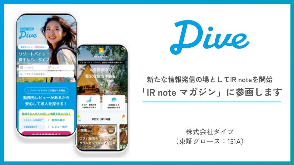 観光施設に特化した人材サービス及び地方創生事業を展開する株式会社ダイブ(東京都新宿区、代表取締役社長:庄子潔、以下「当社」)は、株主や投資家の皆さまに当社についてより深くご理解いただくことを目的として、2024年4月8日(月)よりメディアプラットフォームnoteにて上場企業のIR記事を配信する「IR note マガジン」に参画いたしましたのでお知らせいたします。