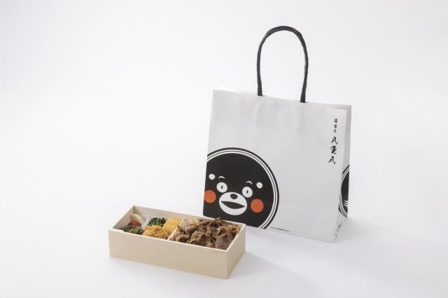 3月23日(木)から羽釜で炊いた熊本県産のお米と黒毛和牛を使ったしぐれ煮が主菜の海苔弁当「羽釜海苔弁くまの重」を限定販売。「くまの重」を購入するとオリジナル限定八重八×くまモン紙袋でお渡しします。