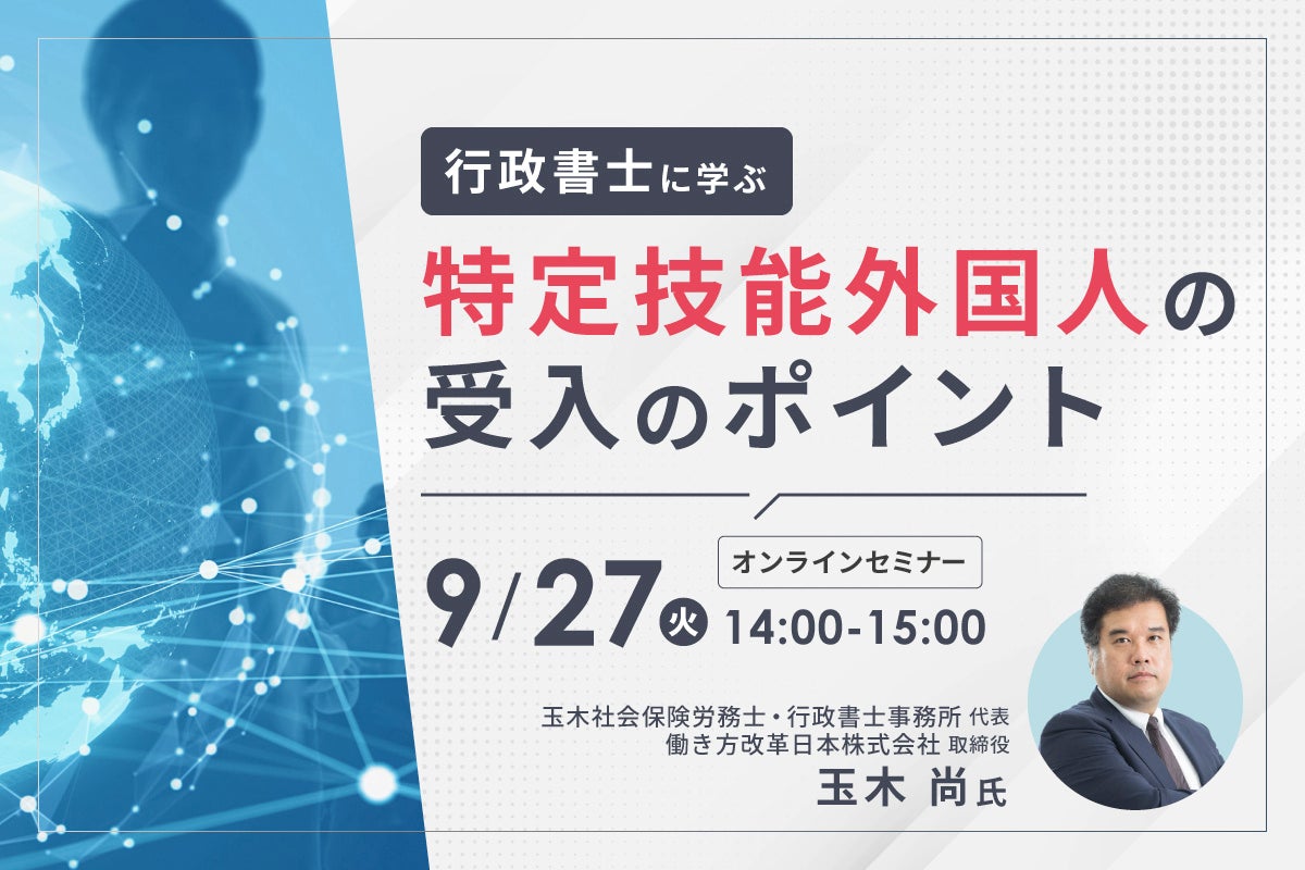 本セミナーでは、行政書士として外国人の在留資格について豊富な知見を持つ玉木 尚氏をお招きし、特定技能在留外国人の受け入れのポイントを解説します。