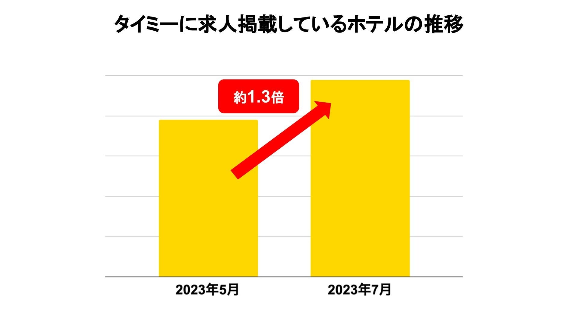 タイミーで求人を掲載いただいているホテルは増加傾向で、今年5月から7月にかけてタイミーで求人を掲載しているホテルの数は約1.3倍となりました。