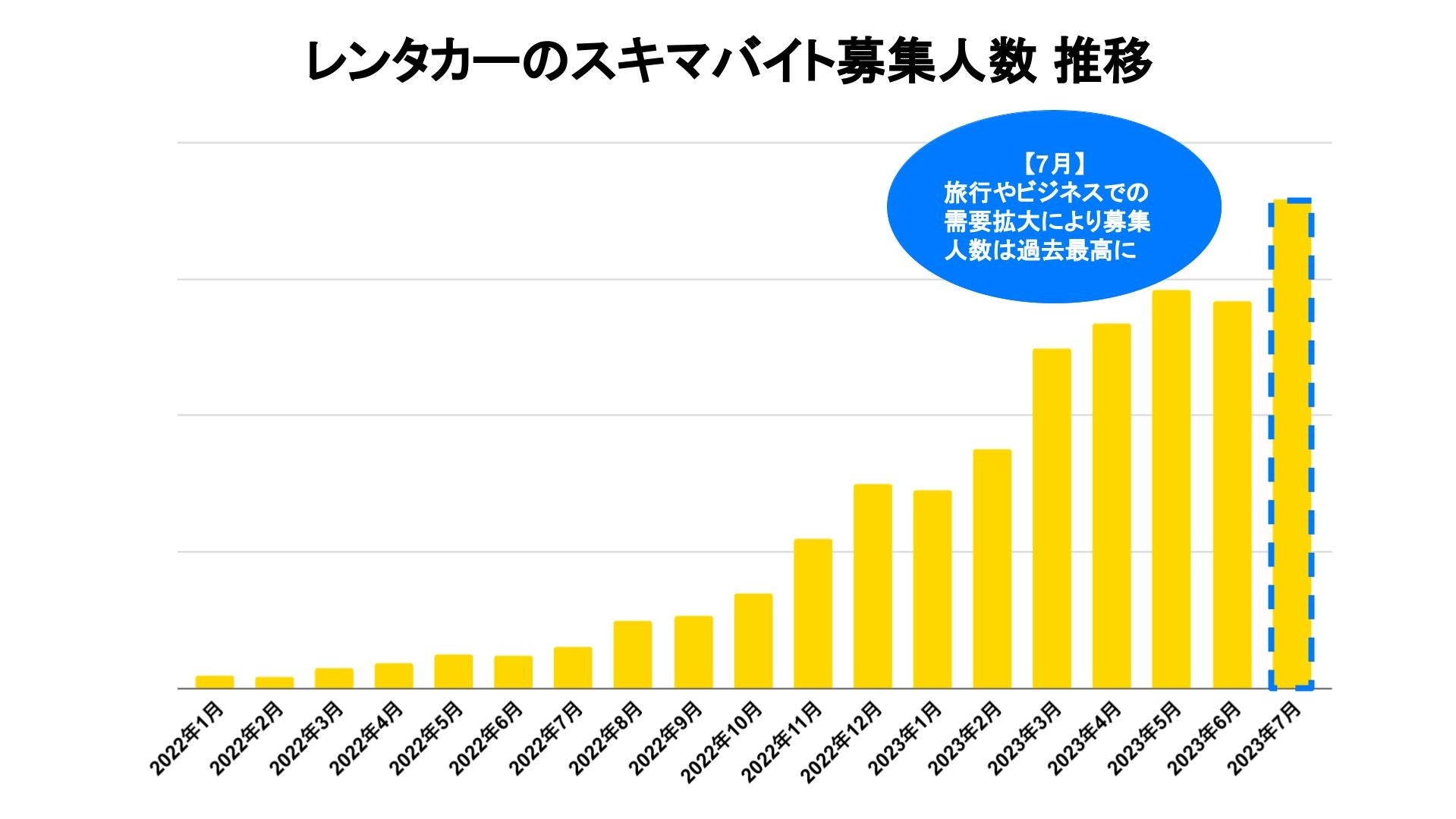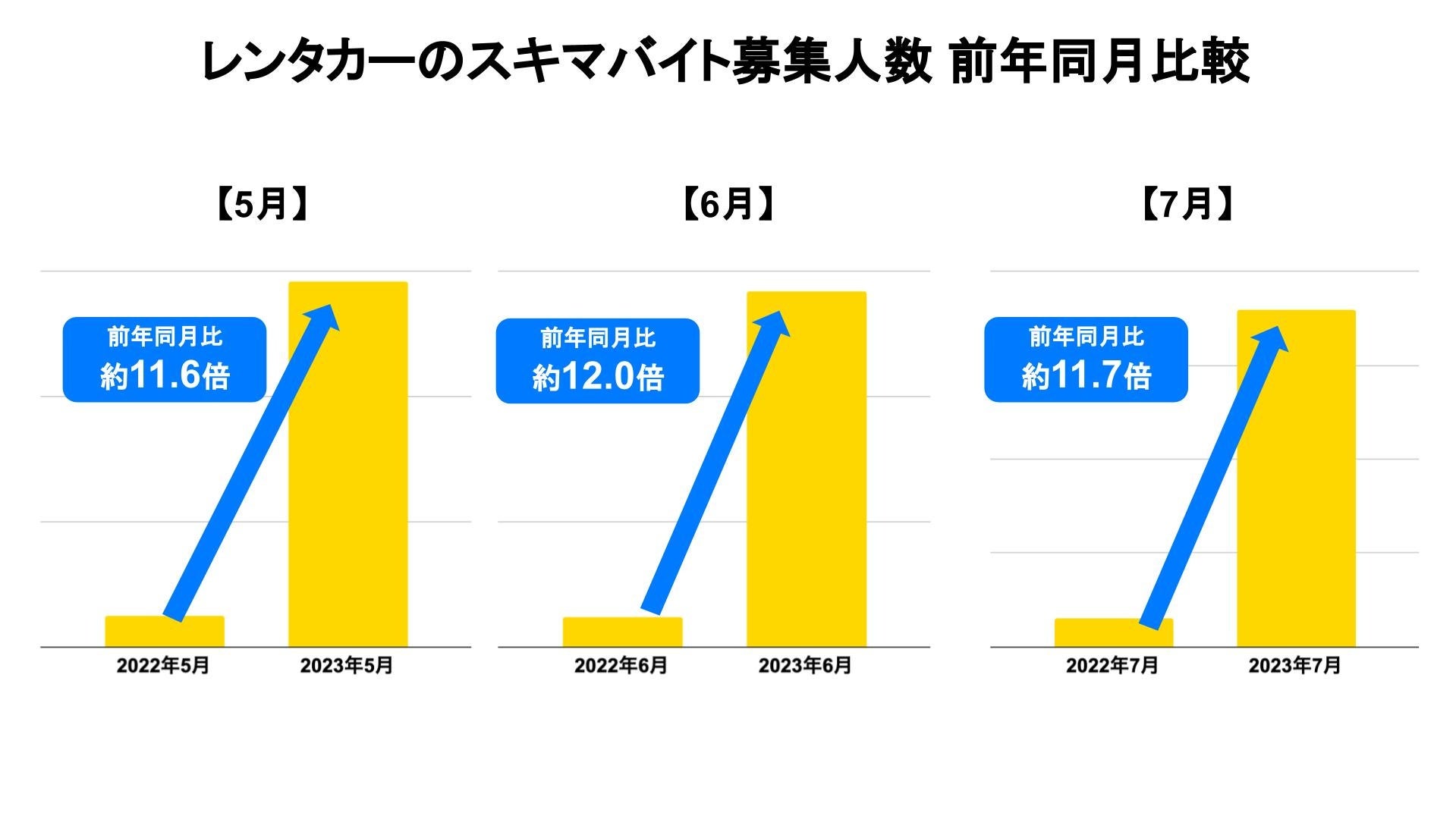 ・タイミー上でのレンタカーのスキマバイト募集人数は7月に過去最高に。前年同月比では、5月は約11.6倍、6月は約12.0倍、7月は約11.7倍に拡大。