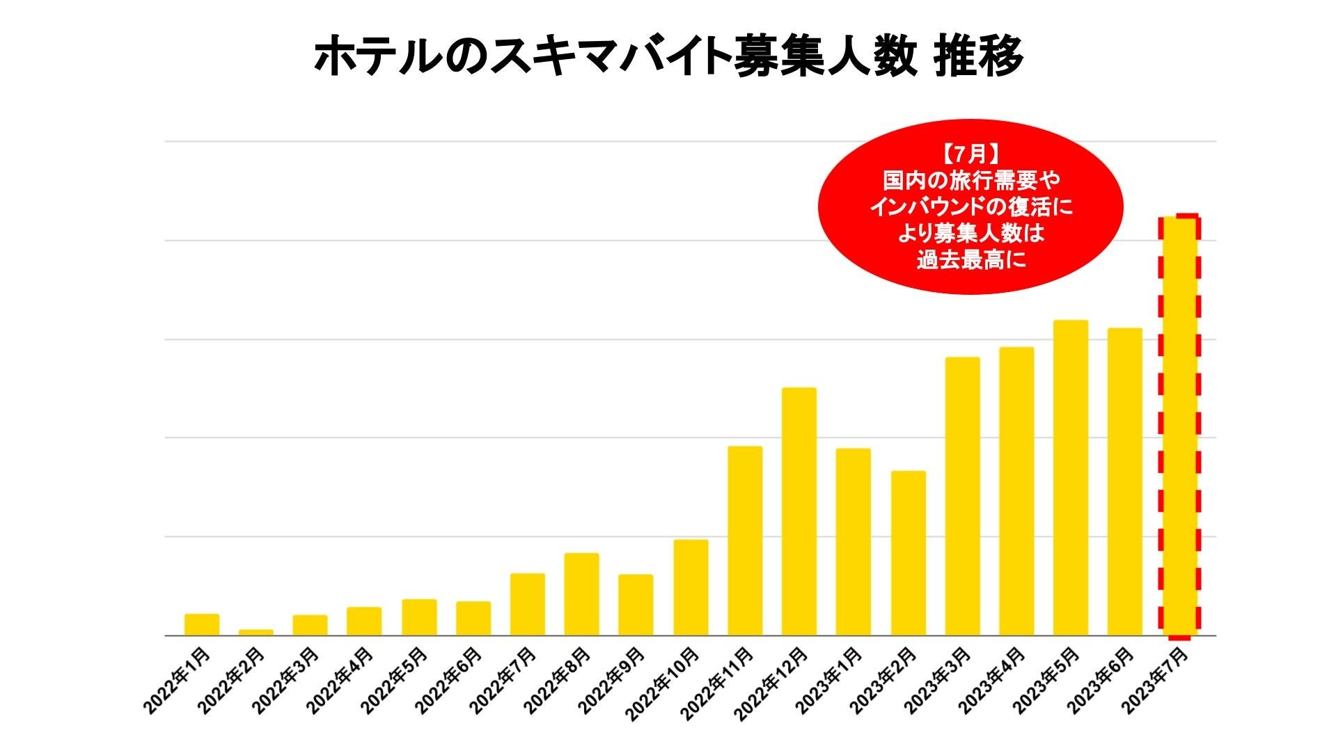 タイミー上に掲載されているホテル業界のスキマバイトの募集人数は増加傾向にあり、直近7月には過去最高となりました。