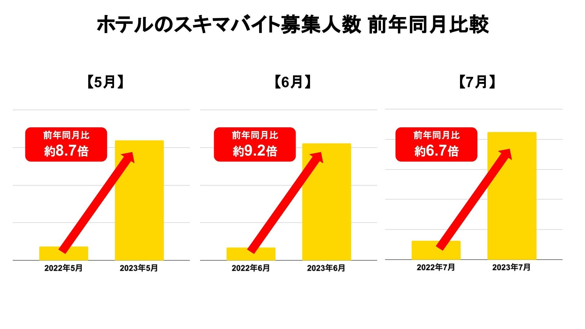 ・タイミー上でのホテルのスキマバイト募集人数は7月に過去最高に。前年同月比では、5月は約8.7倍、6月は約9.2倍、7月は約6.7倍に拡大。