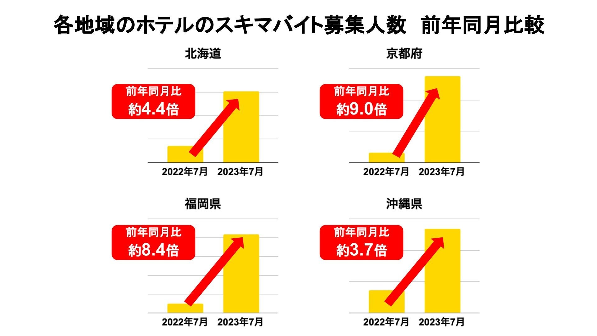 これまでは首都圏のホテルを中心にタイミーをご利用いただいておりましたが、福岡や北海道、沖縄、京都など全国各地のホテルでご活用いただくことが増えています。各地域の募集人数の前年同月比を見てみると、北海道は約4.4倍、京都府は約9.0倍、福岡県は約8.4倍、沖縄県では約3.7倍といずれの地域でも大きく増加しています。