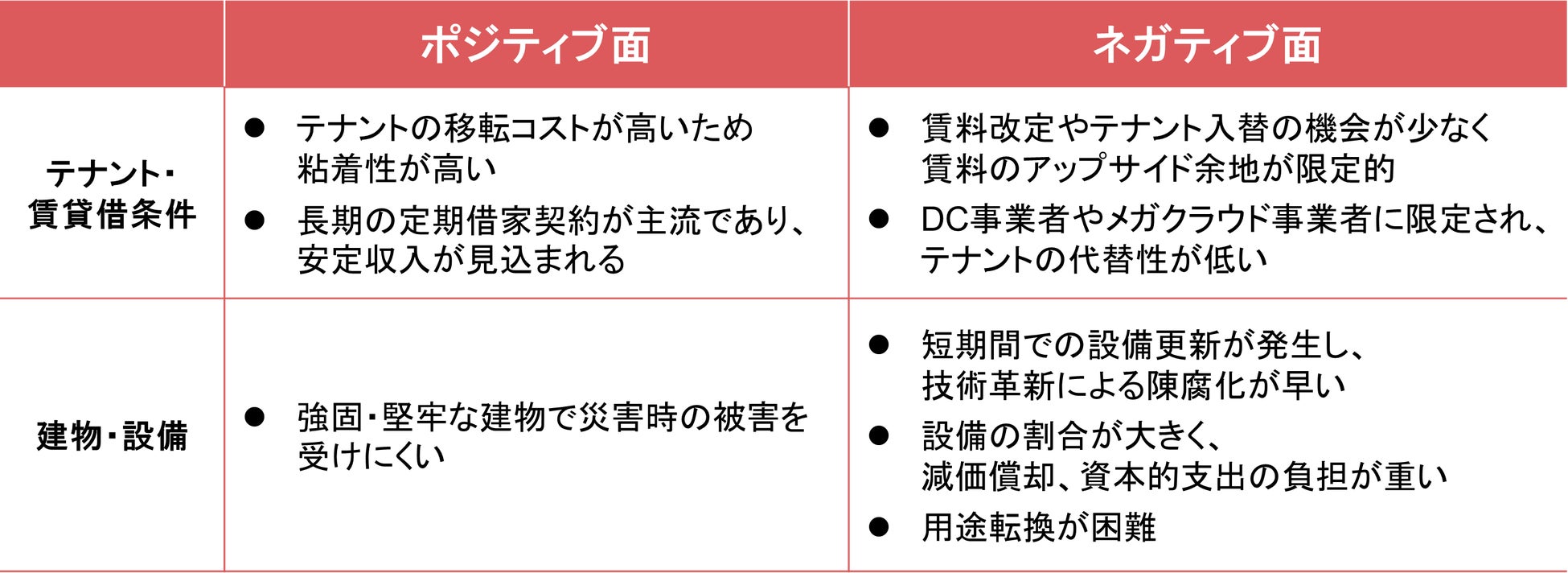 以上を踏まえると、DCの賃貸運営にはテナントおよび建物・設備の特性に起因する特徴があると考えられます。
