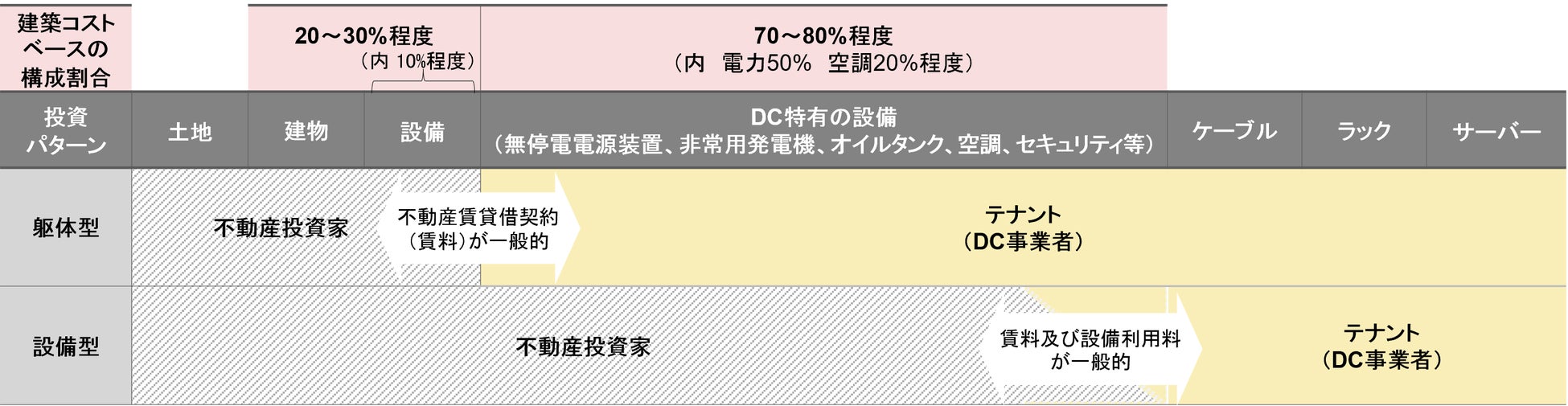 DCへの投資は様々なパターンが考えられますが、本レポートVol.258では、不動産投資家の立場で、下図の通り投資対象を土地・建物・建物附属設備に限定した形態を『躯体型』、これにDC特有の電気・空調等を含めた形態を『設備型』と定義し、解説しています。