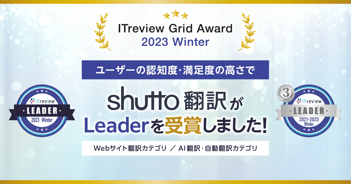 Webサイト翻訳サービス「shutto翻訳」、「ITreview Grid Award 2023 Winter」Leaderの称号を3年連続受賞!受賞を記念したレビューキャンペーンも実施