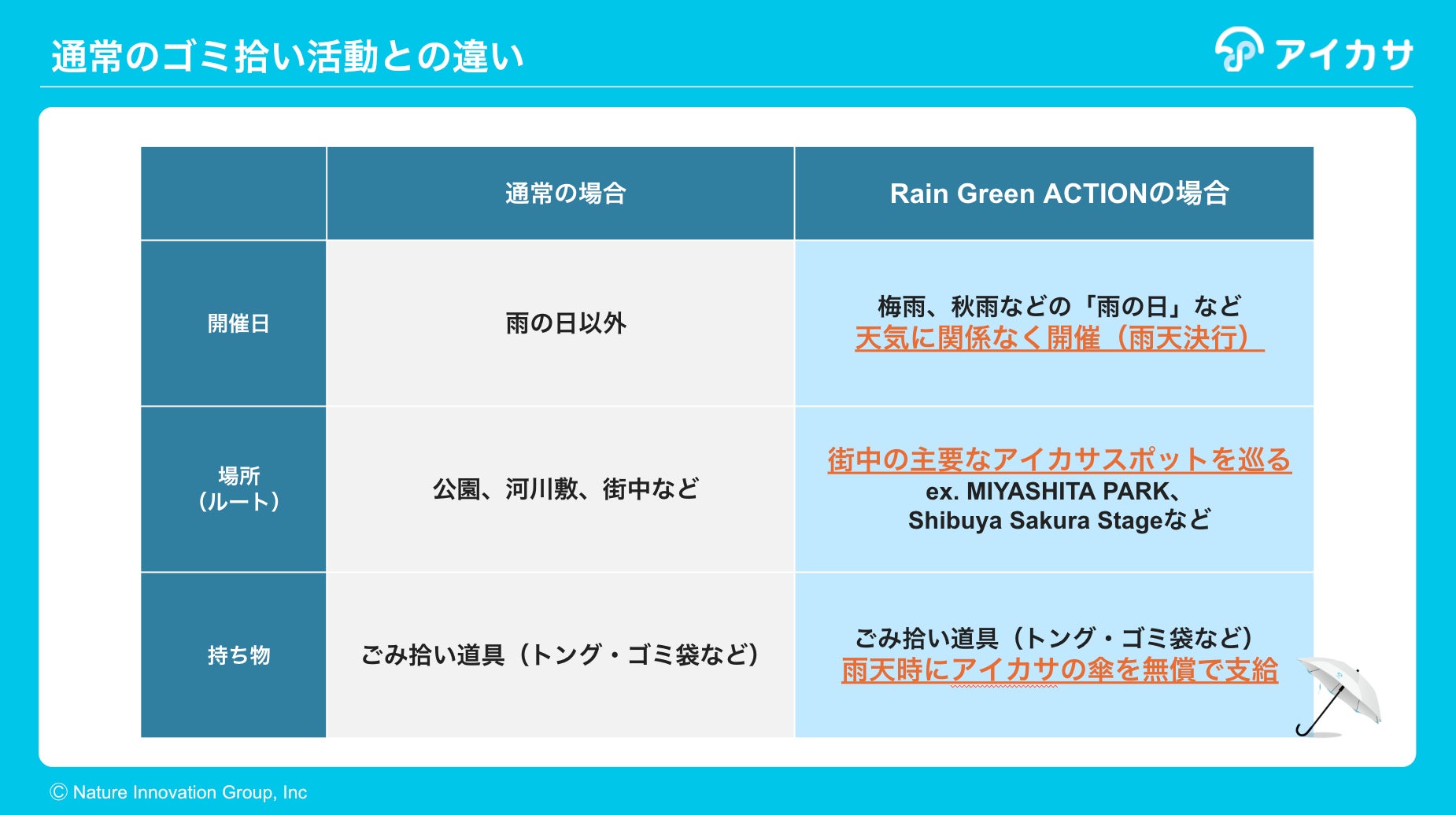 雨の日を快適にハッピーにする傘のシェアリングサービス「アイカサ」を運営する株式会社Nature Innovation Group(本社:東京都新宿区、代表取締役:丸川照司、以下アイカサ)は、環境省サステナビリティ広報大使 兼 一般社団法人ごみプロジェクト代表理事、お笑い芸人マシンガンズの滝沢秀一氏とコラボレーションし、11月1日(金)に、ハロウィン後の渋谷で、「使い捨て傘ゼロ」を目指すごみ拾い活動「Rain Green ACTION in 渋谷」を初開催することをお知らせします。