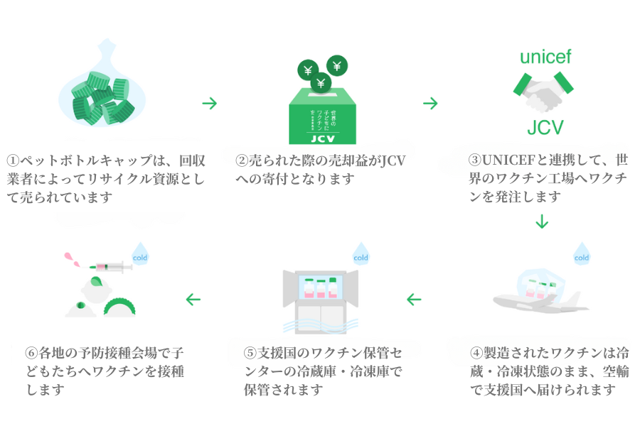 回収したペットボトルキャップは、約1,598人分のポリオワクチンに再資源化され、世界中の未来ある子どもたちのもとへ届いています。