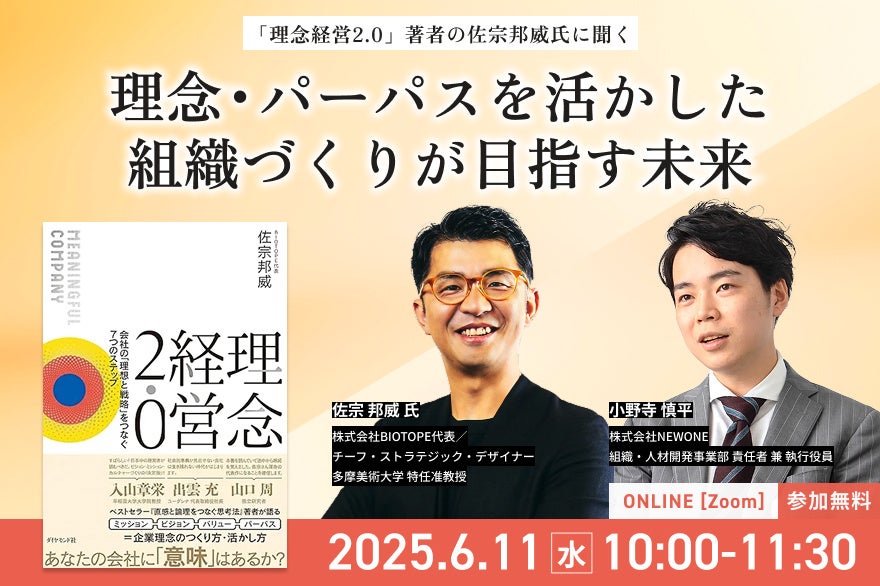 エンゲージメント向上を軸とした組織開発・人材育成コンサルティング支援を通して“推せる職場づくり”を進める株式会社NEWONE(本社:東京都港区 代表取締役:上林 周平、https://new-one.co.jp/ 以下、NEWONE)は、2025年6月11日(水)10:00~11:30にて、「理念経営2.0」著者の佐宗 邦威氏をお招きし、理念経営の実践事例や理念経営の実現の先に目指す未来について、オンラインセミナーを実施いたします。