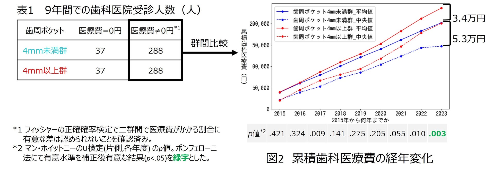 歯周ポケット4mm以上群は4mm未満群に対して、8年間の累積歯科医療費が1人当たり約4万円高くなりました(p<.01、図2)。