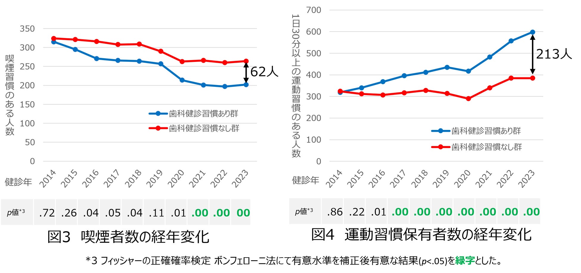 歯科健診習慣あり群は、なし群と比較して、喫煙習慣保有者の減少が大きく、運動習慣保有者の増加が大きかった(図3, 4)