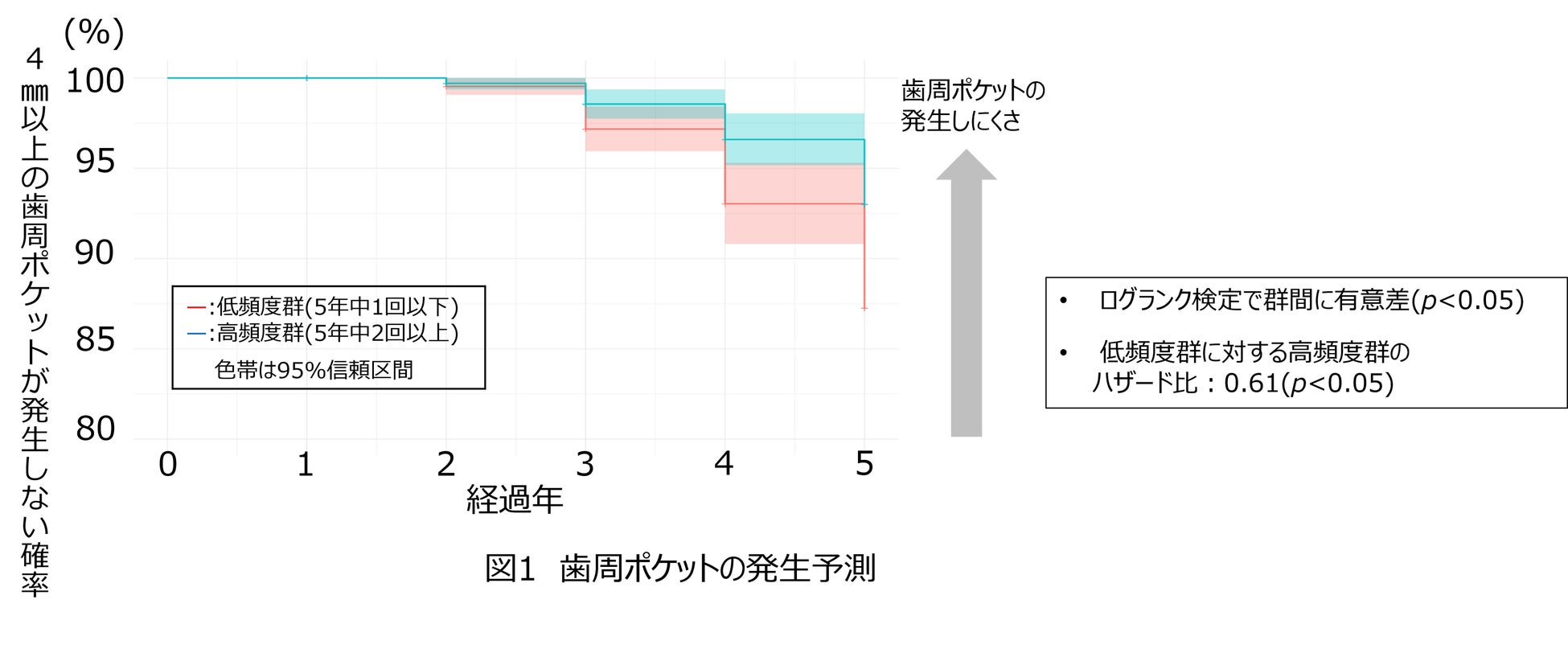 高頻度群は、低頻度群と比較して4mm以上の歯周ポケットの新規発生までの時間が有意に長いことが確認されました(ログランク検定:p<0.05)。さらにコックス比例ハザードモデルによる解析では高頻度群のハザード比は0.61(95%信頼区間0.39-0.96、p<0.05)と推定され、低頻度群と比較して4mm以上の歯周ポケット新規発生リスクが有意に低いことが示されました(図1)。