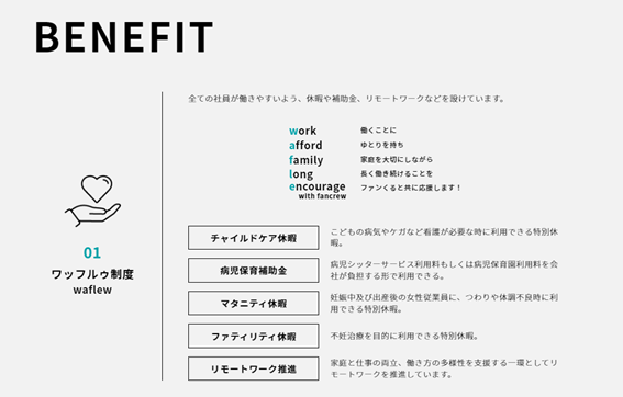 当社では、従業員が家族との時間を大切にしながら、より勤務がしやすい環境づくりに努めています。当社独自の「ワッフルゥ制度」は全社員が仕事と家庭の両立を支援することを目的に設けた制度です。その「ワッフルゥ制度」に、新たに不妊治療を目的に取得できる「ファティリティ休暇」を導入しました。頻繁な通院などによって時間の調整が取りにくく、年次有給休暇だけでは足りないなどの不妊治療特有の課題にも対応するため、より社員が不妊治療をしながら仕事をすることができる環境づくりとサポートすることを目的とした制度です。
