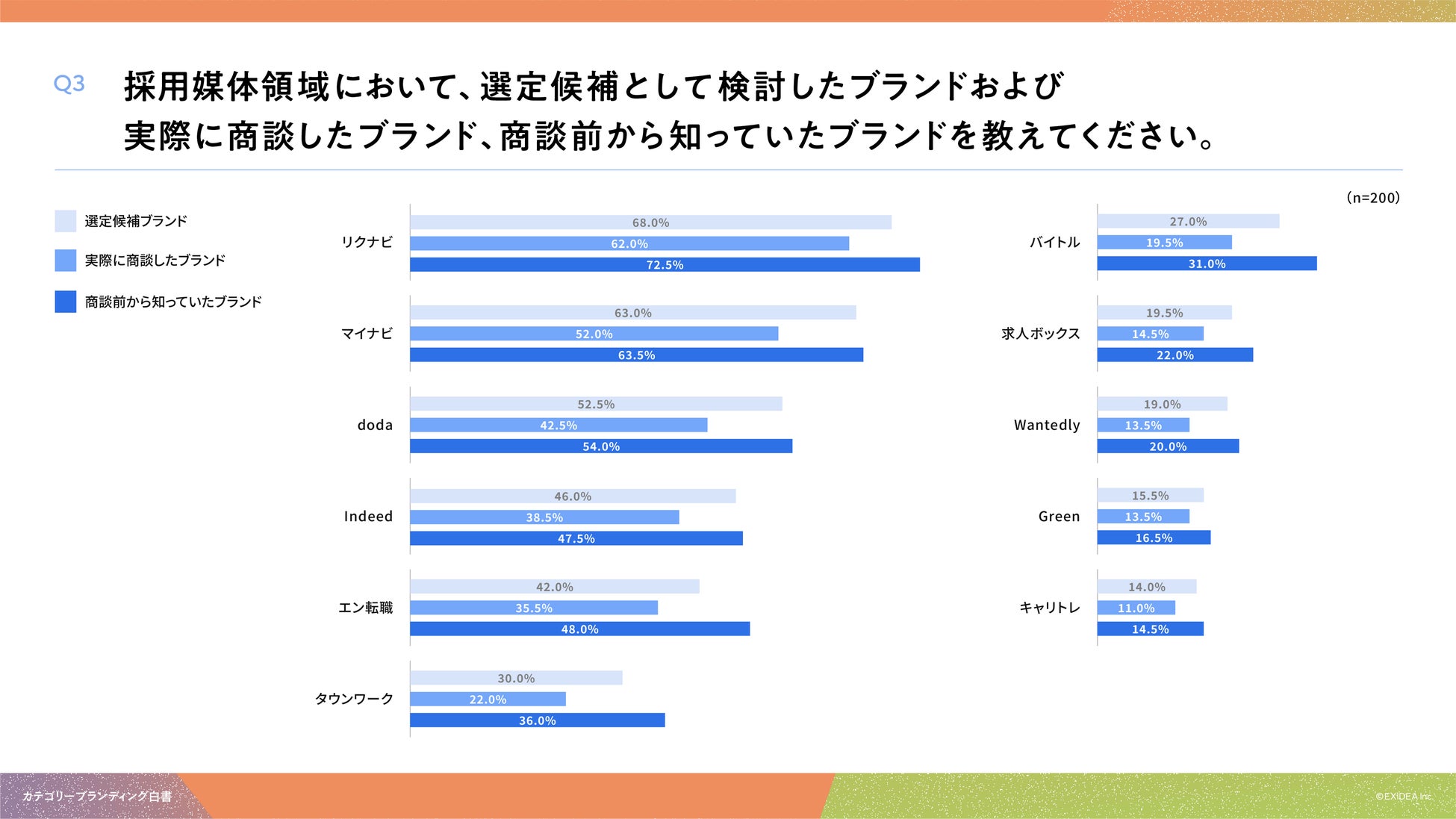「Q3. 採用媒体領域において、選定候補として検討したブランドおよび実際に商談したブランド、商談前から知っていたブランドを教えてください。」(n=200)と質問したところ、選定候補ブランドは「リクナビ」が68.0%、実際に商談したブランドは「リクナビ」が62.0%、商談前から知っていたブランドは「リクナビ」が72.5%という回答となりました。