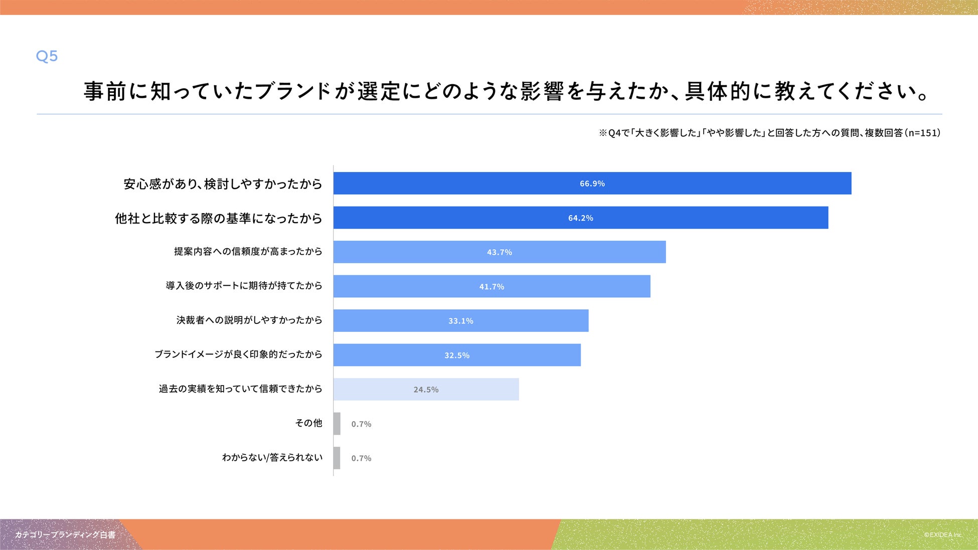 「Q5. Q4で「大きく影響した」「やや影響した」と回答した方にお聞きします。事前に知っていたブランドが選定にどのような影響を与えたか、具体的に教えてください。(複数回答)」(n=151)と質問したところ、「安心感があり、検討しやすかったから」が66.9%、「他社と比較する際の基準になったから」が64.2%、「提案内容への信頼度が高まったから」が43.7%という回答となりました。