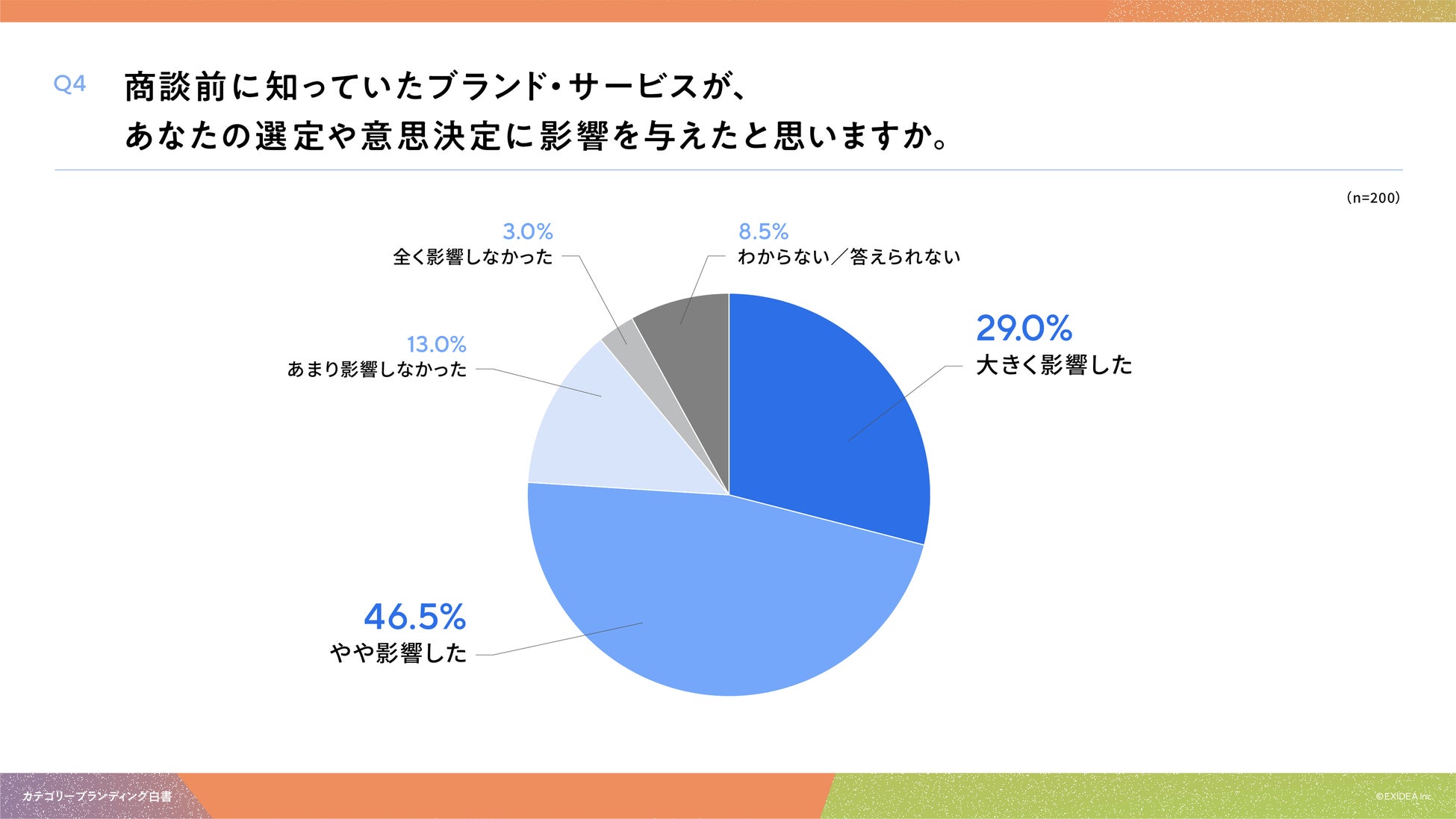 「Q4. 商談前に知っていたブランド・サービスが、あなたの選定や意思決定に影響を与えたと思いますか。」(n=200)と質問したところ、「大きく影響した」が29.0%、「やや影響した」が46.5%という回答となりました。