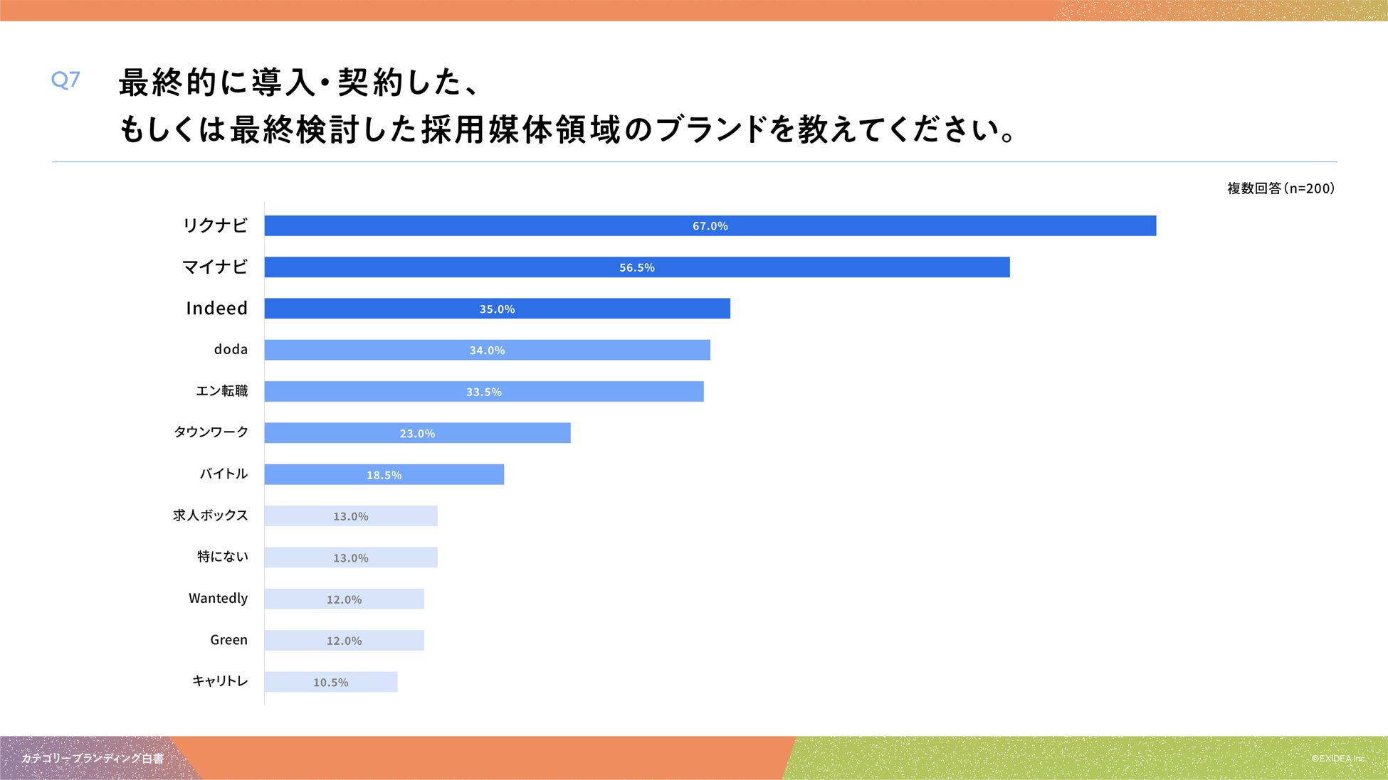 「Q7. 最終的に導入・契約した、もしくは最終検討した採用媒体サービス領域のブランドを教えてください。(複数回答)」(n=200)と質問したところ、「リクナビ」が67.0%、「マイナビ」が56.5%、「Indeed」が35.0%という回答となりました。