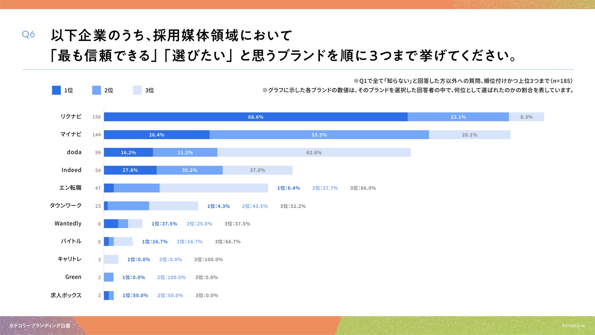 「Q6. Q1で全て「知らない」と回答した方以外にお聞きします。以下企業のうち、採用媒体領域において「最も信頼できる」「選びたい」と思うブランドを順に3つまで挙げてください(順位付けかつ上位3つまで)」(n=185)と質問したところ「1位率*」では、リクナビが68.6%、マイナビが26.4%、dodaが16.2%という回答となりました。