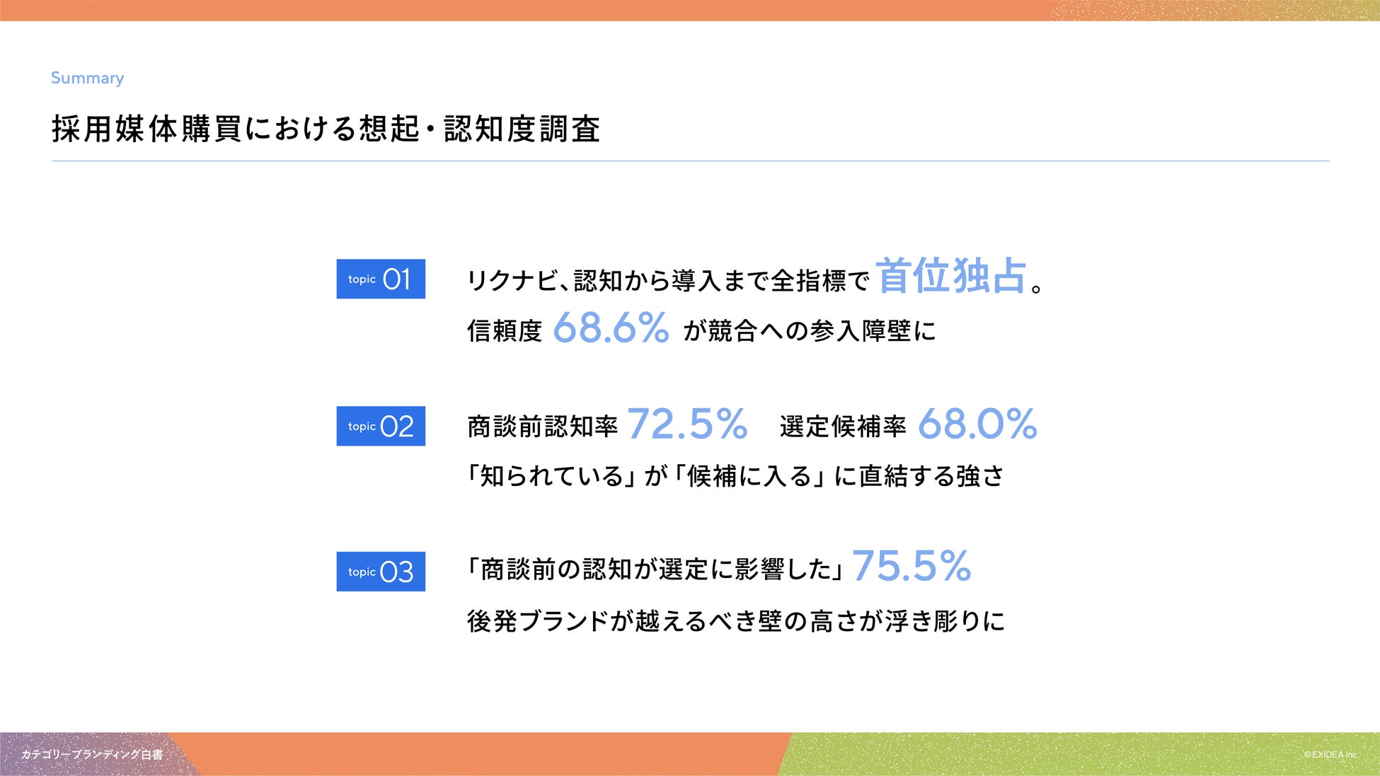 【カテゴリーブランディング白書 vol.5】認知×想起 が顧客の検討プロセスをも塗り替える。採用媒体領域でリクナビが「認知」92.5%、「想起」14.3%で両軸を制し0次選考を支配。