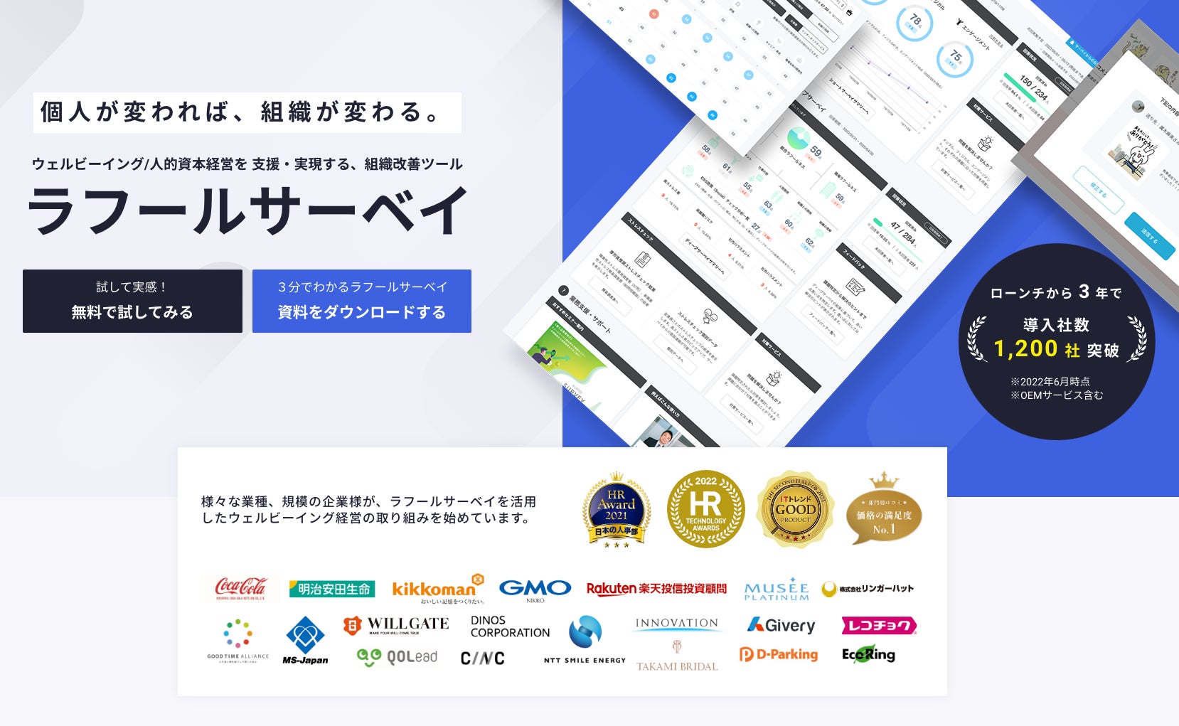 累計1,250社以上に導入いただいている「個人が変われば、 組織が変わる」組織改善サーベイ『ラフールサーベイ』を主軸に、メンタルデータテック®︎(メンタルヘルス×テクノロジー)を活用し、組織のウェルビーイング/人的資本経営の支援を行っております。