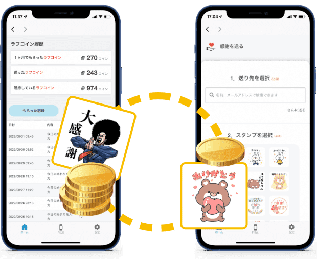 その想いから、個人の行動変容を起こすきっかけとなるサービス、「ラフコイン」・「感謝のキモチ」が生まれました。