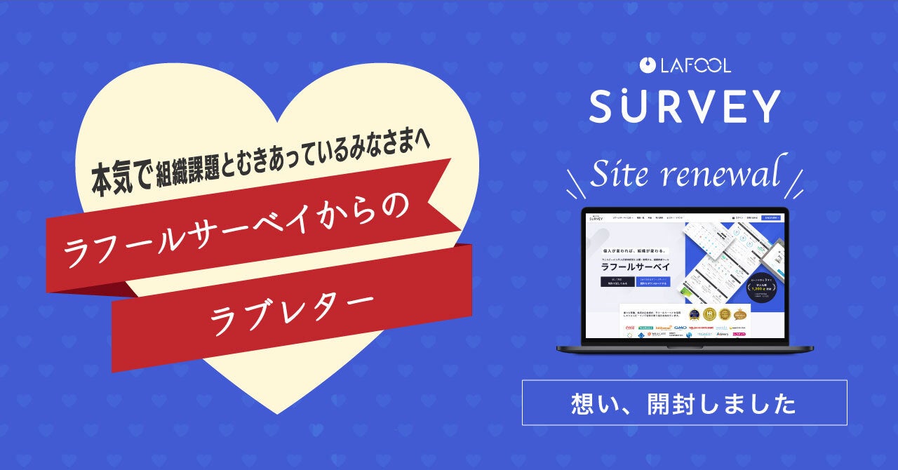 ウェルビーイング/人的資本経営支援の株式会社ラフール(本社:東京都中央区、代表取締役社⻑:結木啓太、以下「ラフール」)は、当社が提供する「個人が変われば、 組織が変わる」組織改善サーベイ『ラフールサーベイ』のサービスサイトを大幅リニューアルいたしました。サイトリニューアルにあたり、みなさまへラフールサーベイからのラブレターをお届けします。