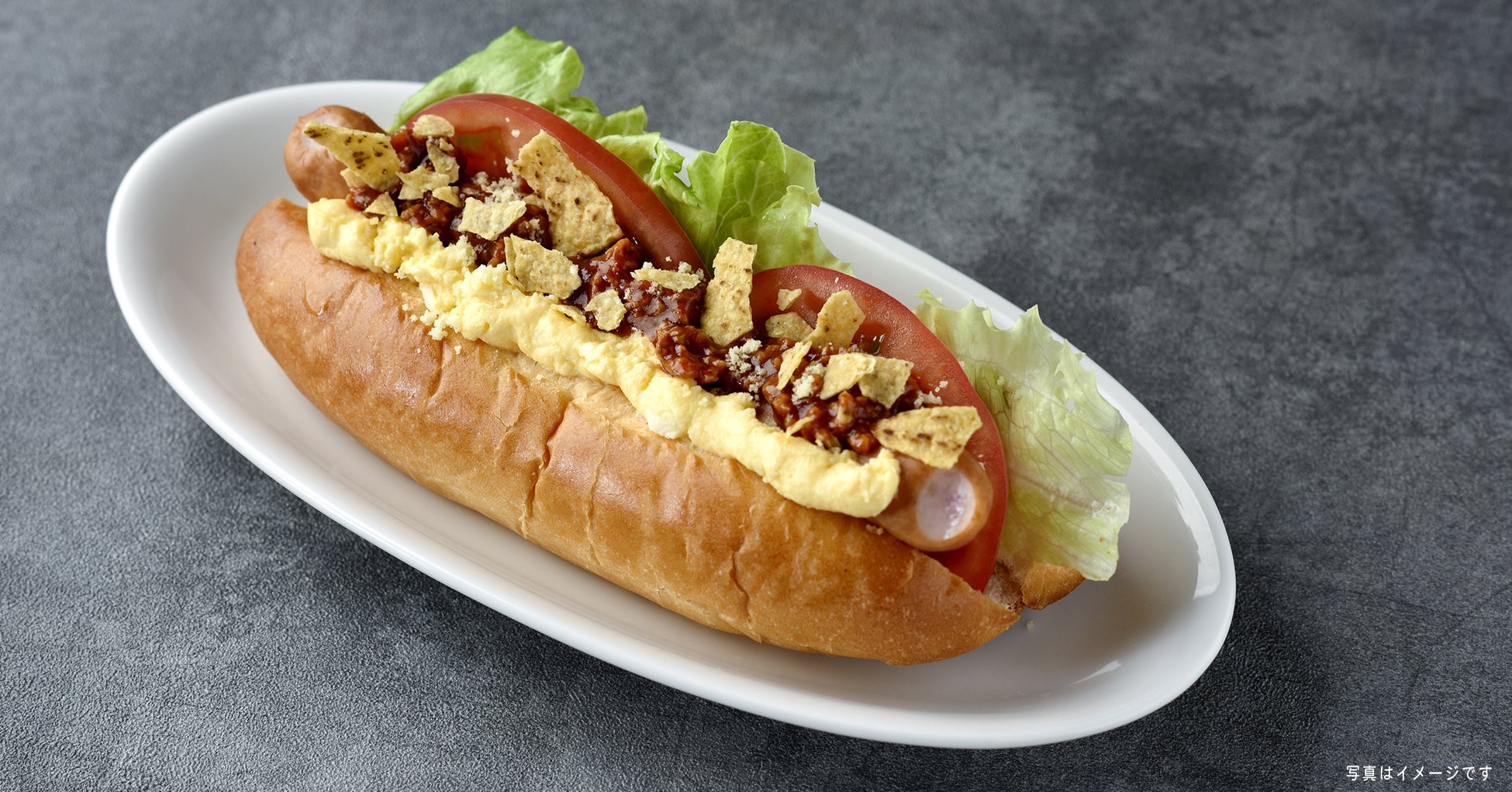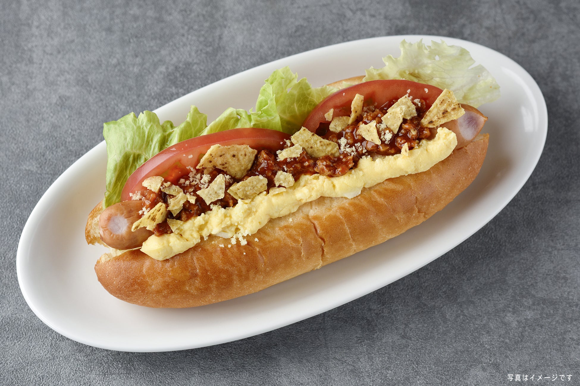 カリっと焼いたソフトフランスパンに、ジューシーなソーセージ、タコスミート、マイルドなたまごサラダとフレッシュな野菜を組み合わせました。トルティーヤのサクサク食感がアクセントになっています。クミンやオレガノといったスパイスやハラペーニョのピリッと辛い刺激が食欲をそそる、メキシカンなホットドッグです。ぜひご賞味ください。