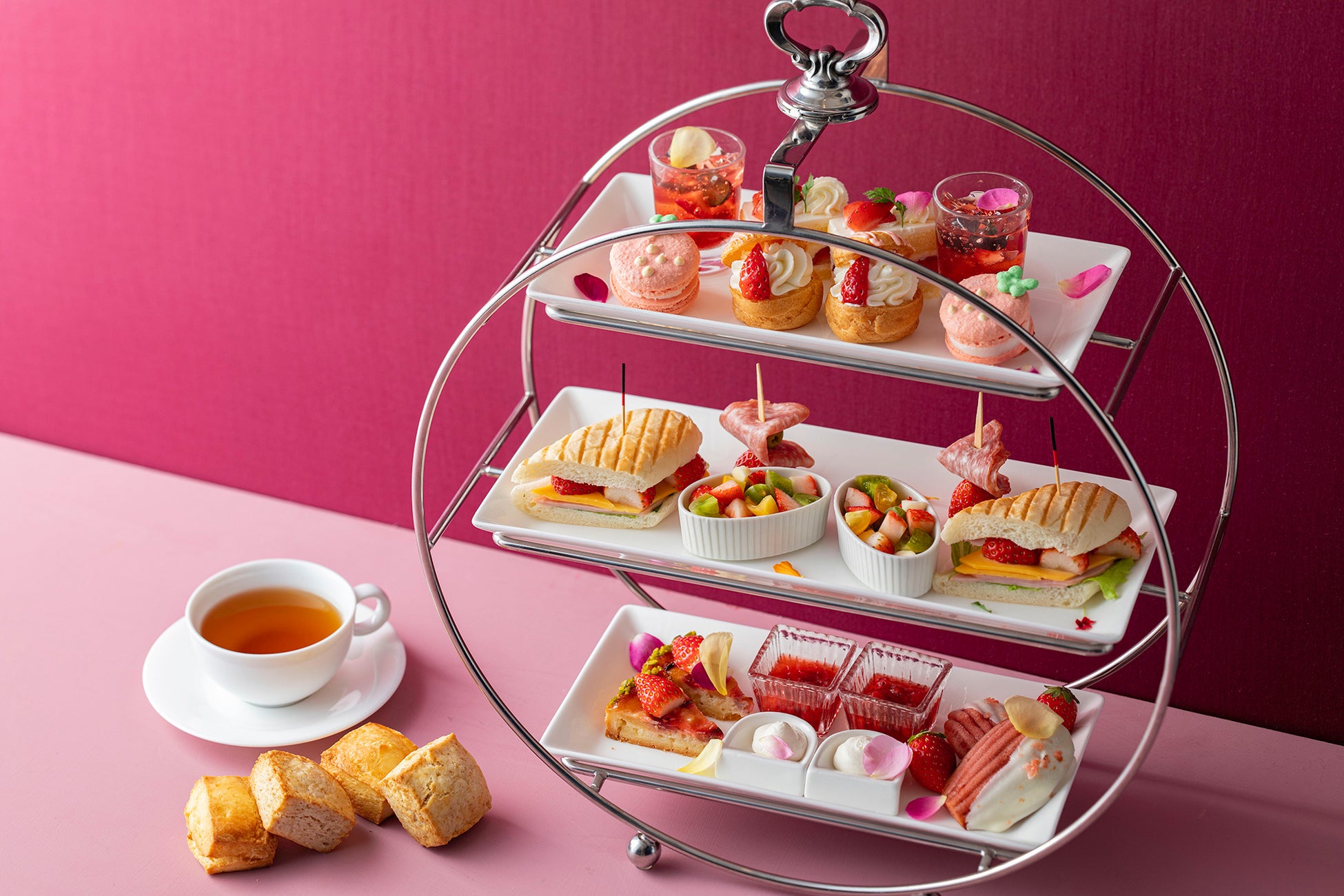 3段スタンドに並んだ甘酸っぱい苺と上品なローズが香るスイーツなどと一緒に、約15種のメニューから90分間お好きなだけ選べるドリンク。