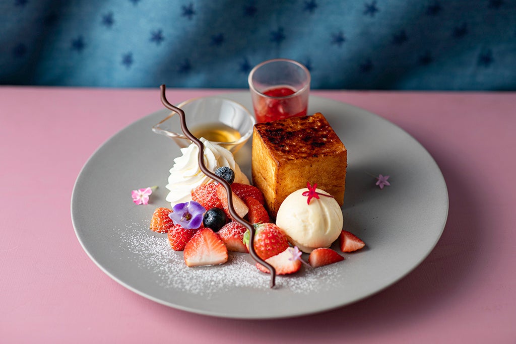 上面はカラメルでカリっと、中はモチっとしたフレンチトースト。自家製パンそのままでも、苺ソースや東京多摩のはちみつなどと一緒に、お好みの食べ方で。