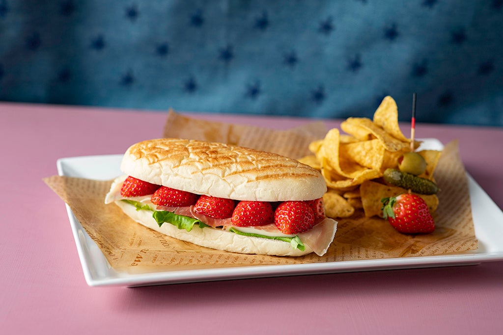 甘酸っぱい苺と生ハムの塩味、まろやかなモッツァレラチーズがモチモチとしたパニーニとの相性抜群。バランスの良い味わいをお楽しみください。