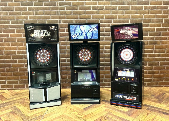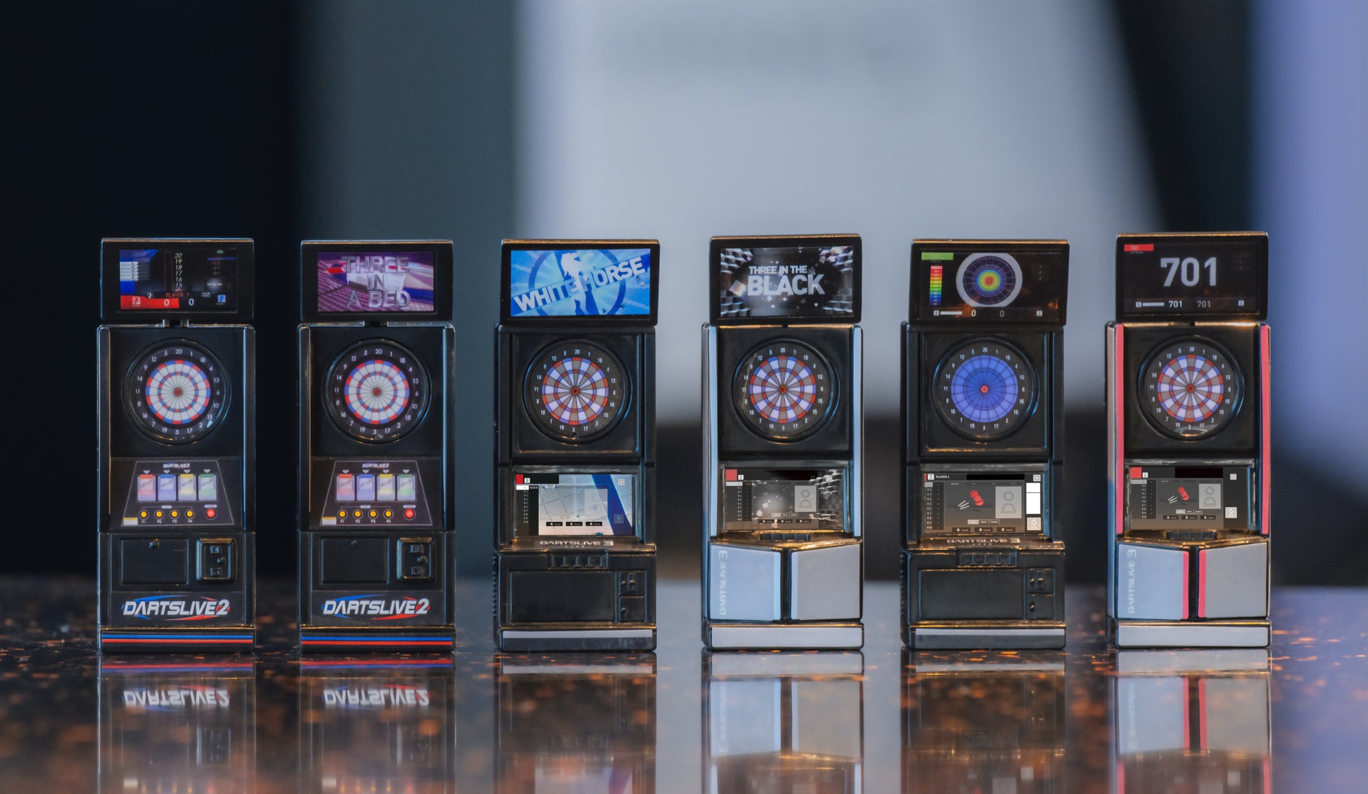 LEDの光る盤面や通信対戦、オリジナルのパーティーゲームなどを搭載した「ダーツライブ2」、タッチパネルでの直感的な操作や矢が盤面のどこに刺さったのかを検知するフルビットセンサー、矢の速度を測定する機能など最新技術を盛り込んだ「ダーツライブ3」を展開しています。
