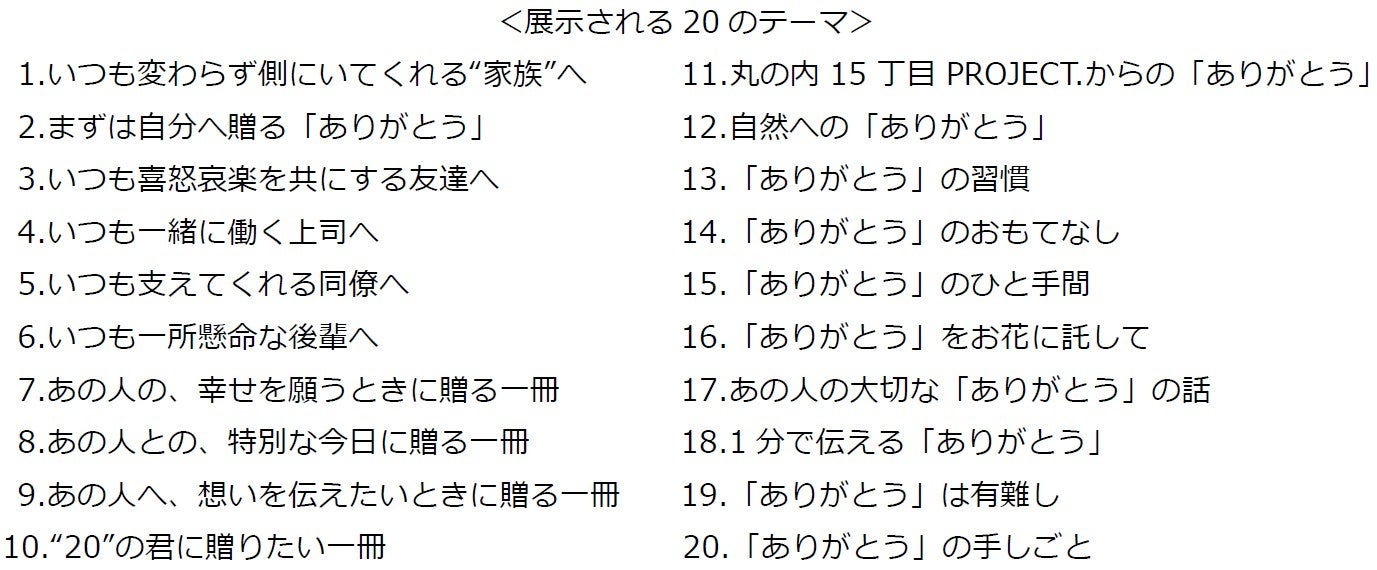 開催2年目となる今年のテーマは「感謝」。丸ビル1階マルキューブでは、家族、恋人、友人、上司、同僚など身近な方への様々な「ありがとう」の気持ちを伝える約400冊におよぶ書籍を、丸ビル開業20周年にちなんで20個のテーマに沿って展示します。丸ビルから「感謝」の気持ちを込めて、本イベントで選書した心に響く「ありがとう」が伝わる書籍の中から、今の自分にあった「ありがとう」の伝え方が書き綴られた1冊に出会える場を提供します。展示書籍は、自由に手に取り、会場内に設置されたベンチにてお読みいただけます。