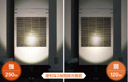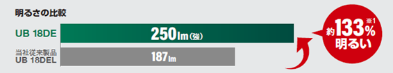 明るさを調整できる、便利な2段階調光機能を搭載しています。また、当社従来製品であるUB 18DELに比べ、約133%※1の明るさです。