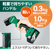 蓄電池未装着時で0.3kg、マルチボルト蓄電池BSL 36A18搭載時で1.0kgと軽量。さらに、ハンドルにはエラストマがついているため握りやすいです。