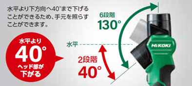 水平より下方向へ40℃まで下げることができるため、手元を照らすことができます。