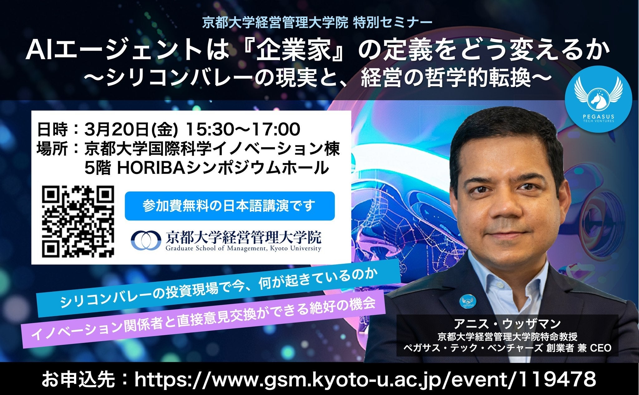 京都大学経営管理大学院主催の特別セミナー「AIエージェントは『企業家』の定義をどう変えるか ―シリコンバレーの現実と、経営の哲学的転換―」において、 弊社代表であり京都大学経営管理大学院特命教授のアニス・ウッザマンがスピーカーとして登壇いたします。